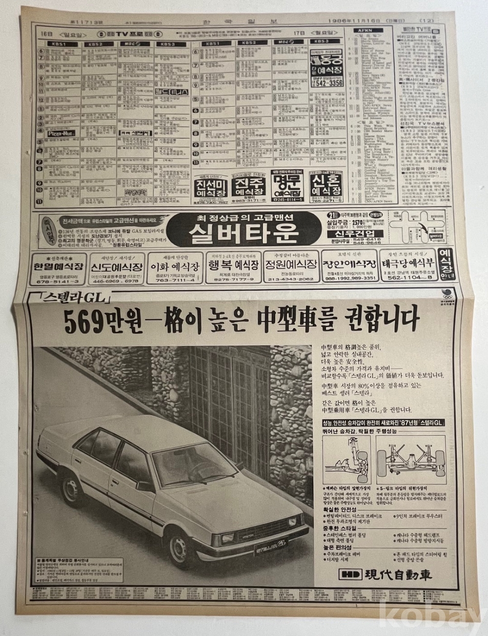 현대자동차 스텔라 자동차 광고가 실린 1986년 조선일보 낱장입니다.