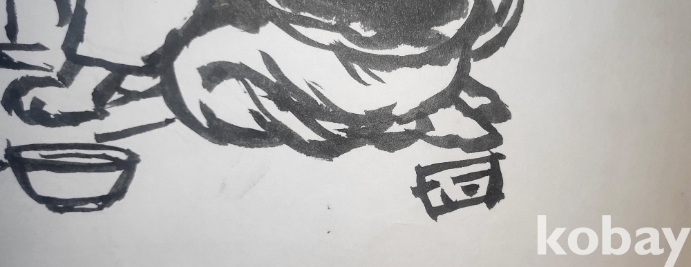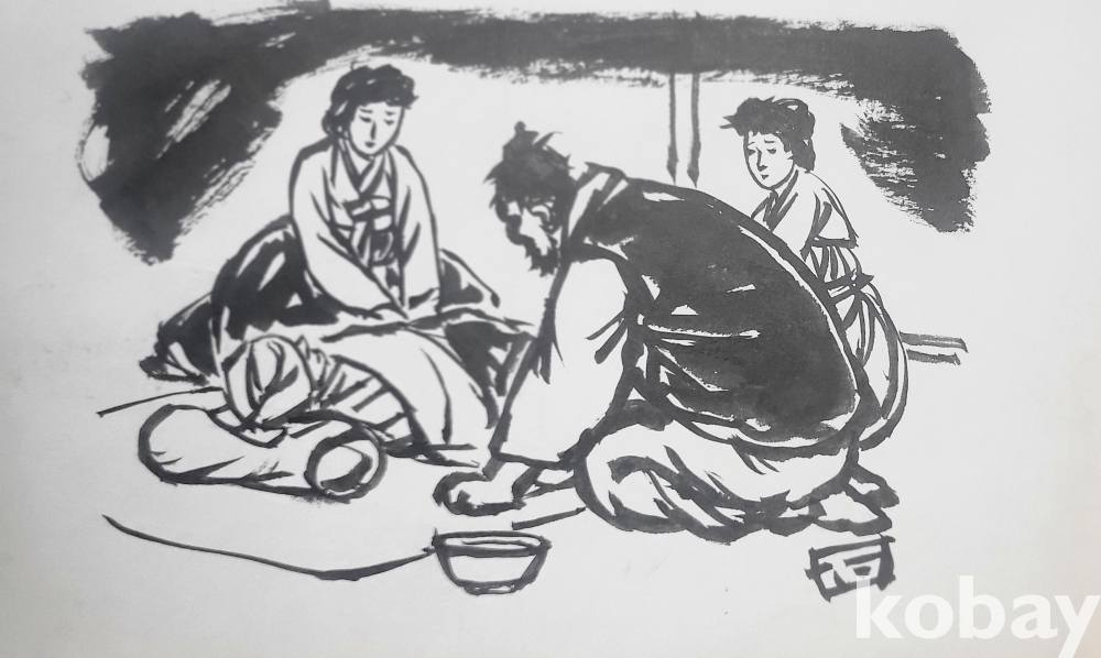 물과 먹으로 만 직접 그려진 수묵화 삽화입니다,