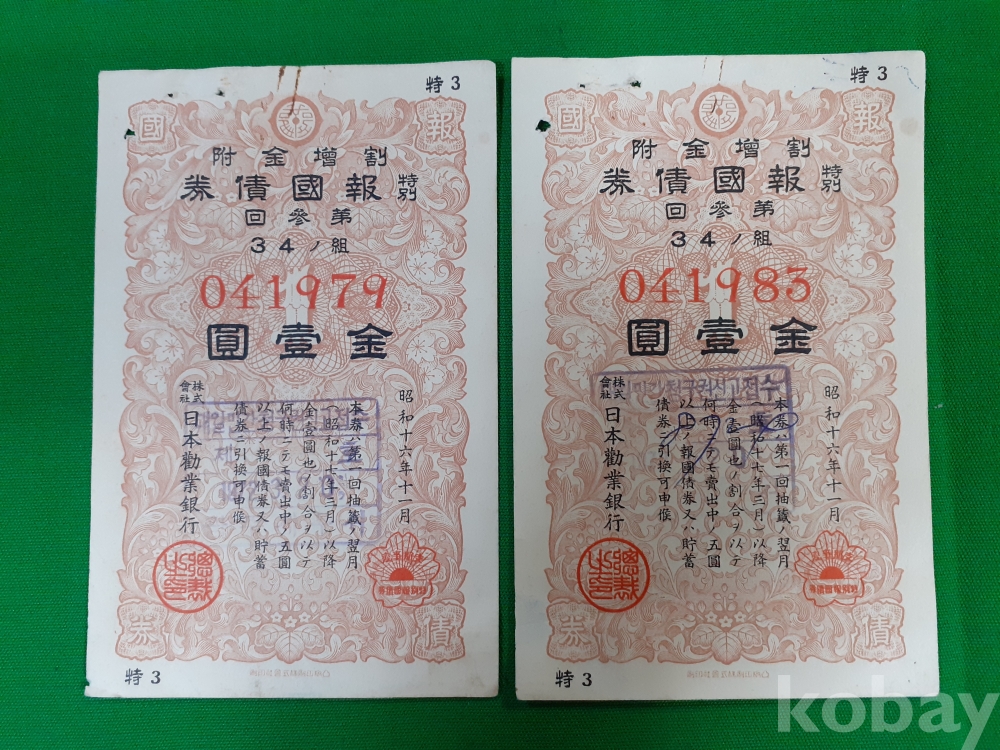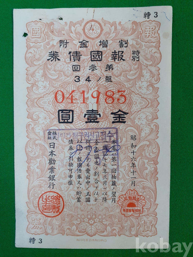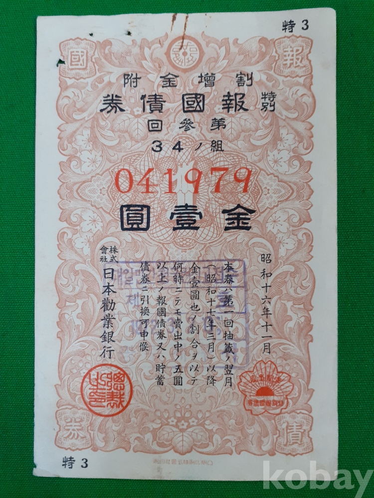 일본 권업은행에서 발행한 특별 보국채권입니다. 이 채권은 태평양 전쟁 기간인 쇼와 16년(1941년) 11월에 발행된 것으로, 전쟁 자금 조달을 위해 민간에서 자금을 모으기 위해 만들어진 채권입니다.