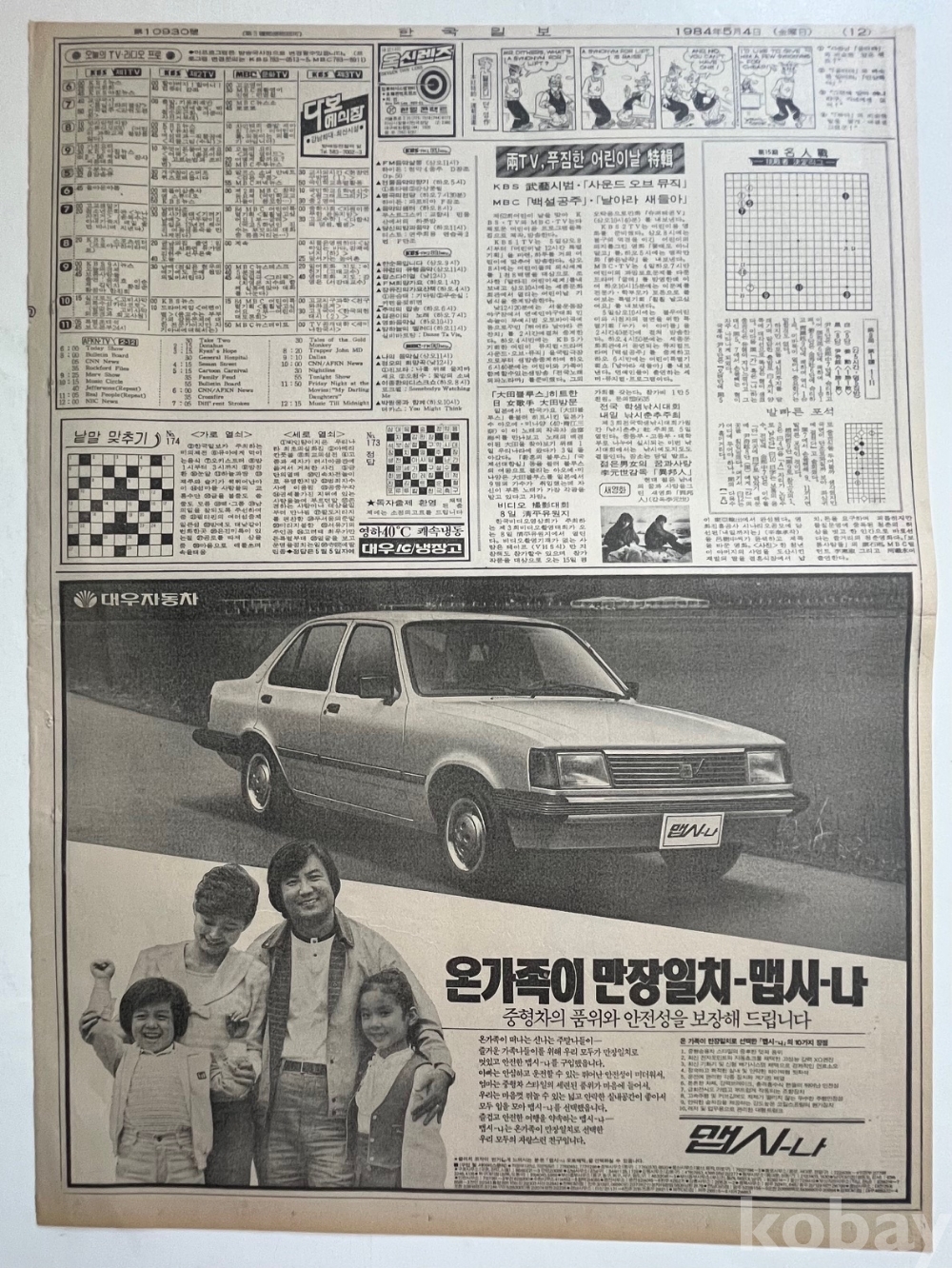 대우자동차 맵시나 광고가 실린 한국일보 낱장입니다.