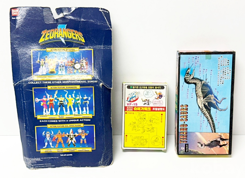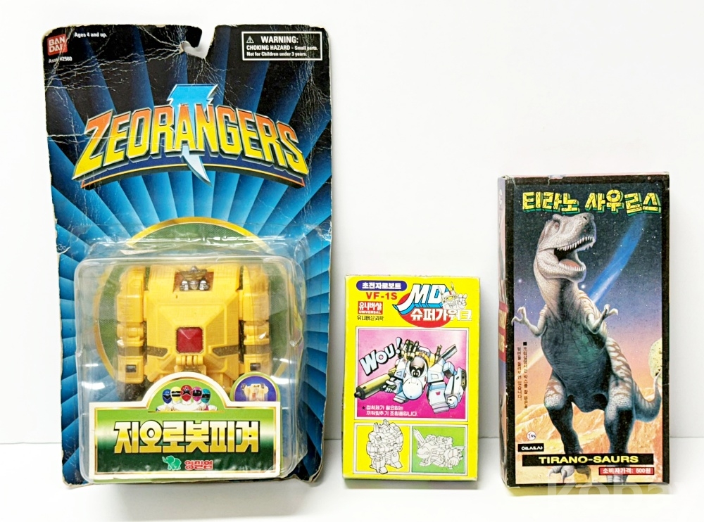 상품설명 | 1. 영실업 / 지오로봇피겨 / 19 x 31.5 cm 2. 유니버샬과학 / VF-1S 초전자로보트 'MD 슈퍼가워크' / 9.2 x 14 cm 3. 연신사 / 티라노 사우르스 / 11 x 21 cm 총 3점. | ||