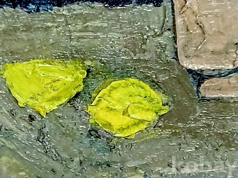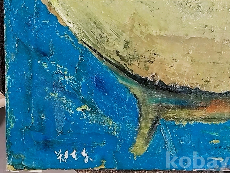 나이프 터치로 그린 추상작품으로, 서명부분만 빼고, 채색시 물감에 실밥이나 흙 등