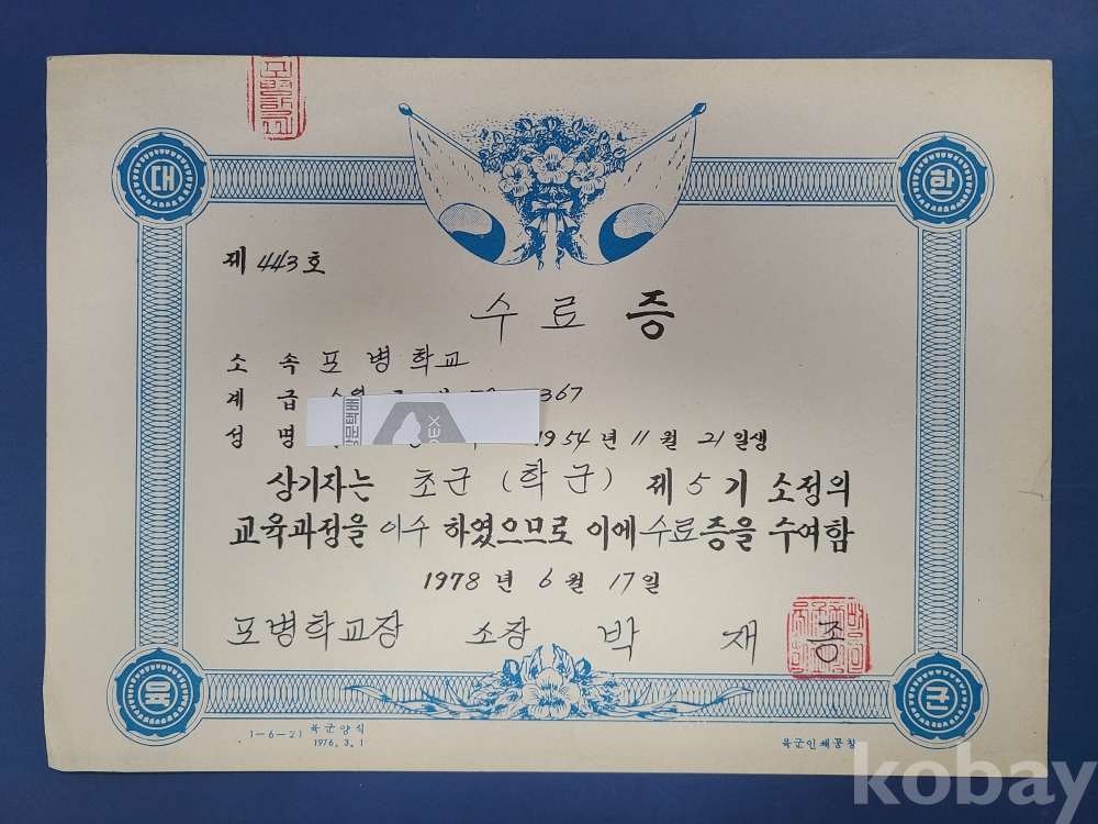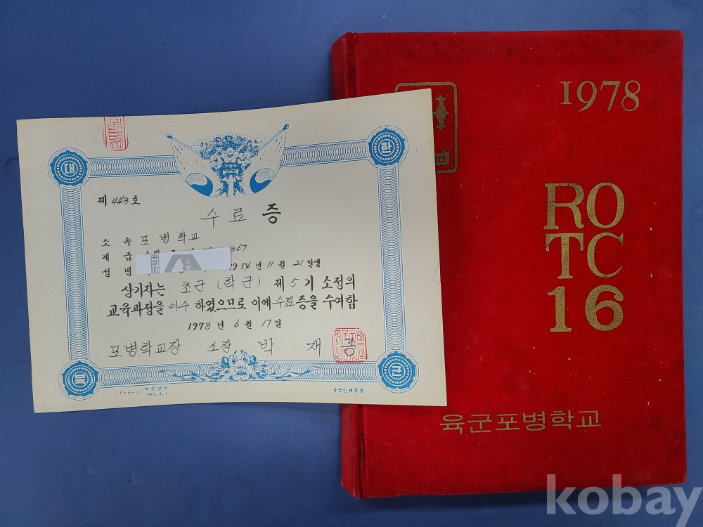 1978년 육군포병학교 학군초군반 제5기 R.O.T.C 제16기 졸업기념 사진첩.수료증