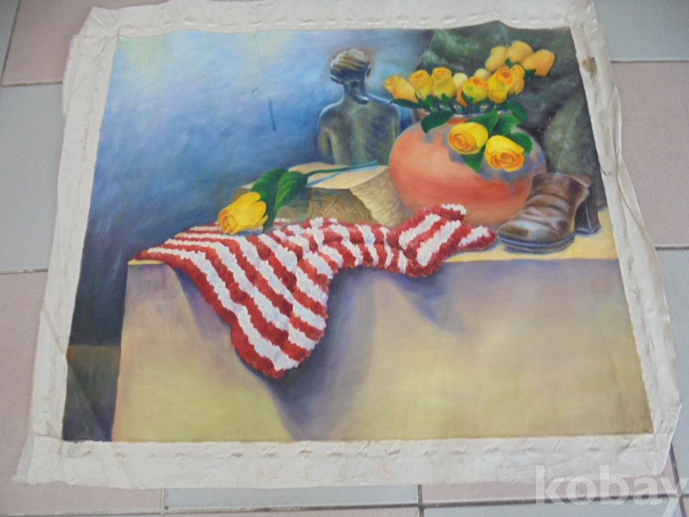 서로어울리지도않는 연관도없는 기명군방화 구두1짝 따개진나무 받침대 무늬수건 웬여인 불론주 아무튼 다양한 특이한 정물유화