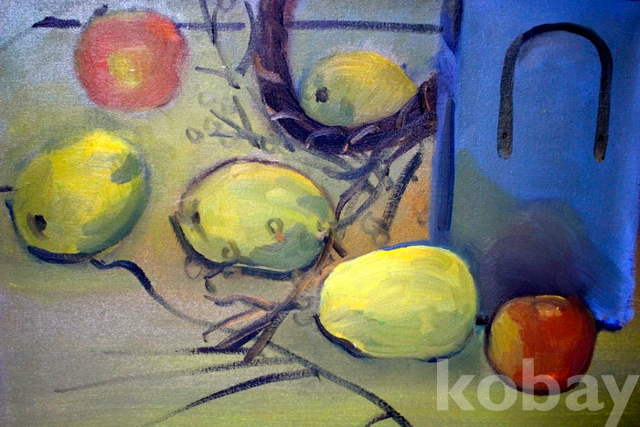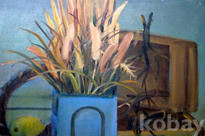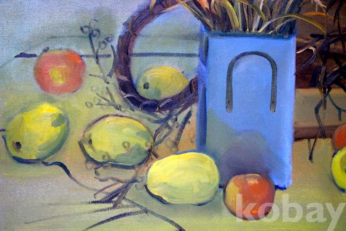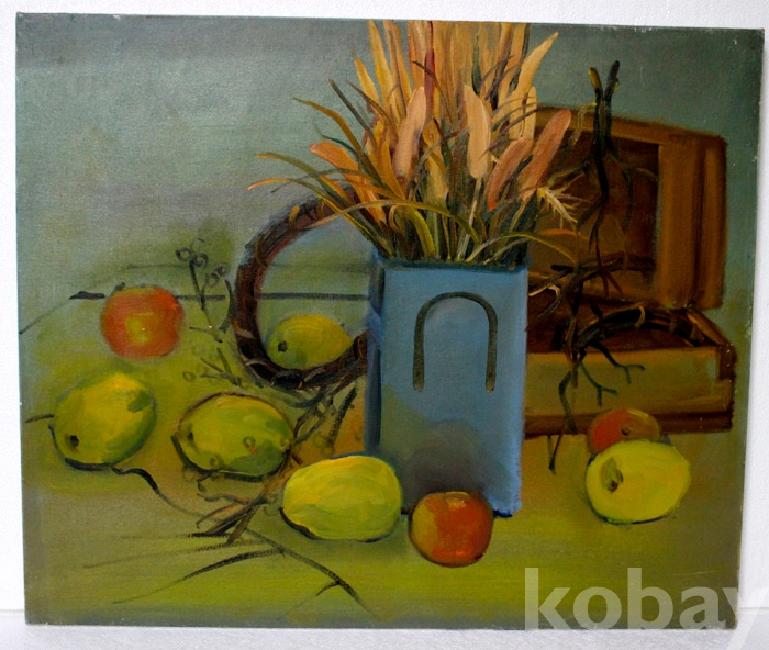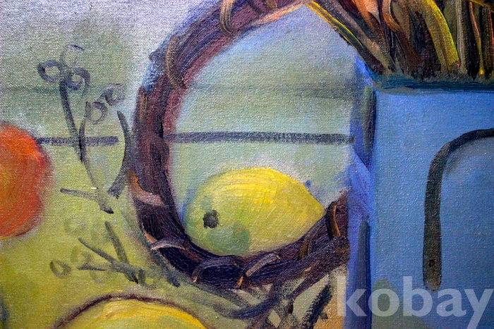 (유화) 작가미상의 유화 정물 - 테이블 위의 화병속의 꽃과 과일 (20 F)