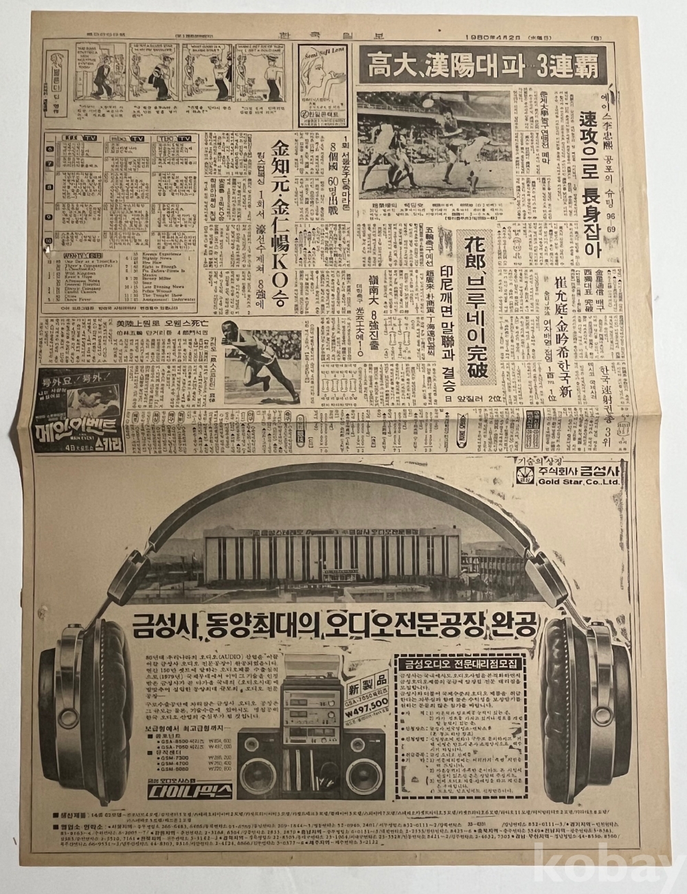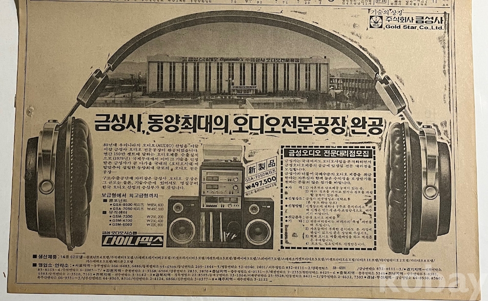 금성의 동양 최대 오디오 전문공장을 구로수출공단에 완공했다는 광고가 실린 1980년 한국일보 낱장입니다.