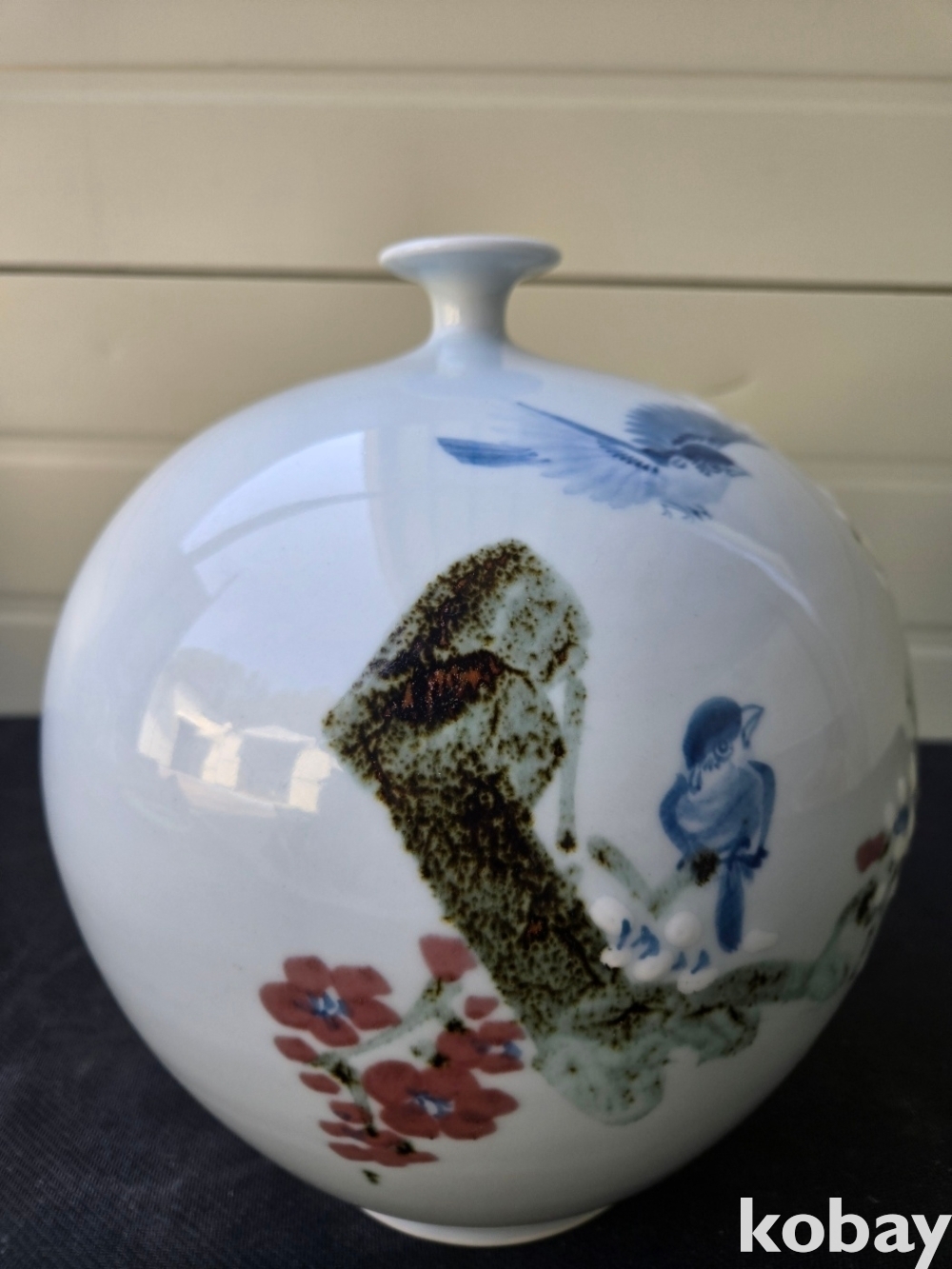 매화꽃과 새 표현 입이 작은 도자기 입니다.