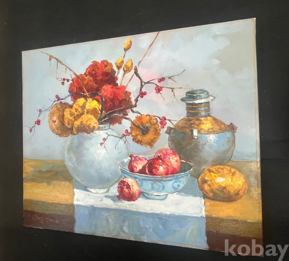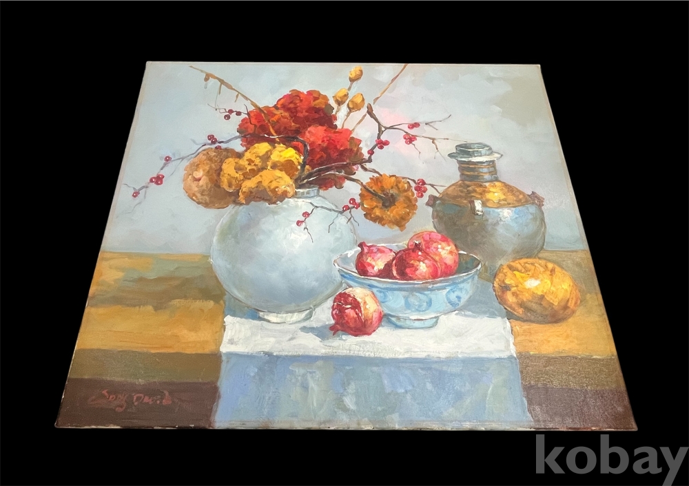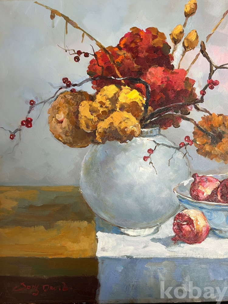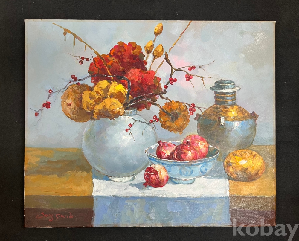 화려한 전시경력은 이미지로 찍어 올렸습니다 캔버스 위에 유화로 그려진 작품입니다. 하얀 백자 항아리에 여러 꽃이 가득 꽂아져 있고, 흰 접시와 테이블보에 올려진 석류는 빨갛게 잘 익어 벌어진 모습입니다. 모과와 뒤에 놓인 화병이 균형을 더하고 있습니다. 작품의 하단에 영문의 수결이 잘 쓰여 있으며 캔버스 뒤에도 제작 날짜(1998)와 수결이 한문으로 쓰여 있습니다. 전체적으로 화사한 느낌으로 풍부한 색채감이 잘 느껴집니다. 따뜻하고 부드러운 필치로 실물의 느낌이 잘 살아 있으며, 안정적인 구도로 세련되고 멋스러운 작품입니다. 액자로 만들어 전시하면 어느곳이든 공간을 가득 채워줄 유화 작품입니다. 좋은 작품을 저렴히 올리고 있습니다. 수집하기 좋은 기회이니 이 기회를 놓치지 마시고 구매하시어 감상해보시기 바랍니다.