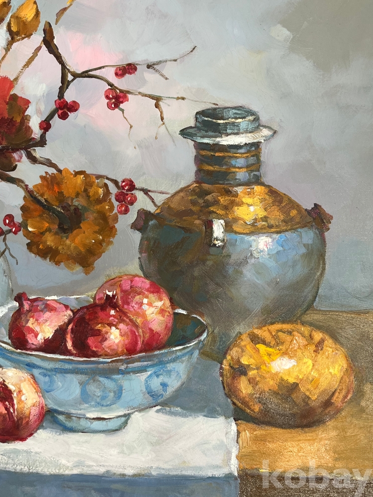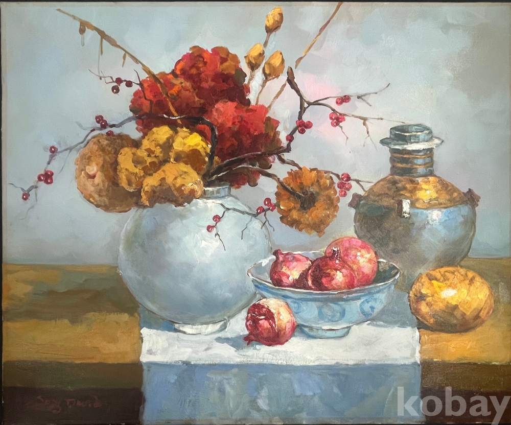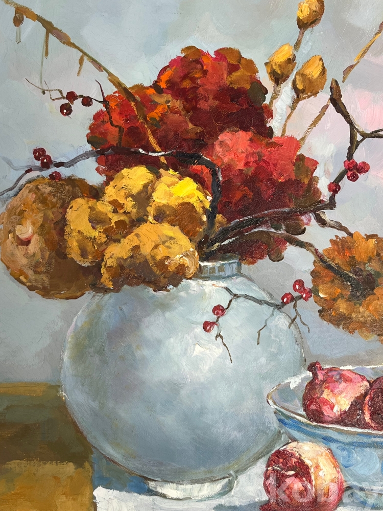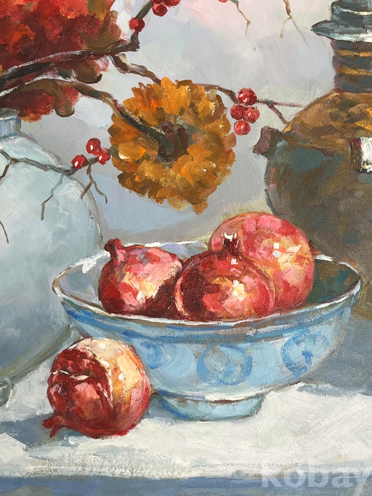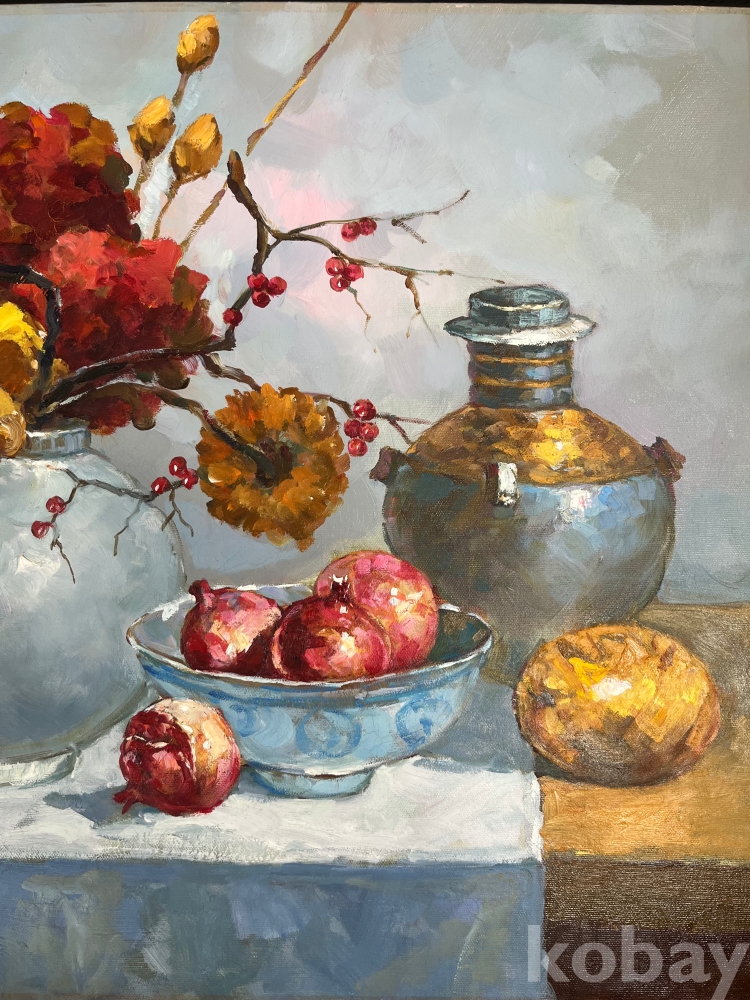 화려한 전시경력은 이미지로 찍어 올렸습니다 캔버스 위에 유화로 그려진 작품입니다. 하얀 백자 항아리에 여러 꽃이 가득 꽂아져 있고, 흰 접시와 테이블보에 올려진 석류는 빨갛게 잘 익어 벌어진 모습입니다. 모과와 뒤에 놓인 화병이 균형을 더하고 있습니다. 작품의 하단에 영문의 수결이 잘 쓰여 있으며 캔버스 뒤에도 제작 날짜(1998)와 수결이 한문으로 쓰여 있습니다. 전체적으로 화사한 느낌으로 풍부한 색채감이 잘 느껴집니다. 따뜻하고 부드러운 필치로 실물의 느낌이 잘 살아 있으며, 안정적인 구도로 세련되고 멋스러운 작품입니다. 액자로 만들어 전시하면 어느곳이든 공간을 가득 채워줄 유화 작품입니다. 좋은 작품을 저렴히 올리고 있습니다. 수집하기 좋은 기회이니 이 기회를 놓치지 마시고 구매하시어 감상해보시기 바랍니다.