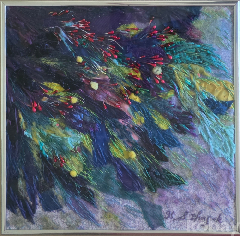 찢어서 견사를 섞어 스케치에 따라 수를 놓는다.