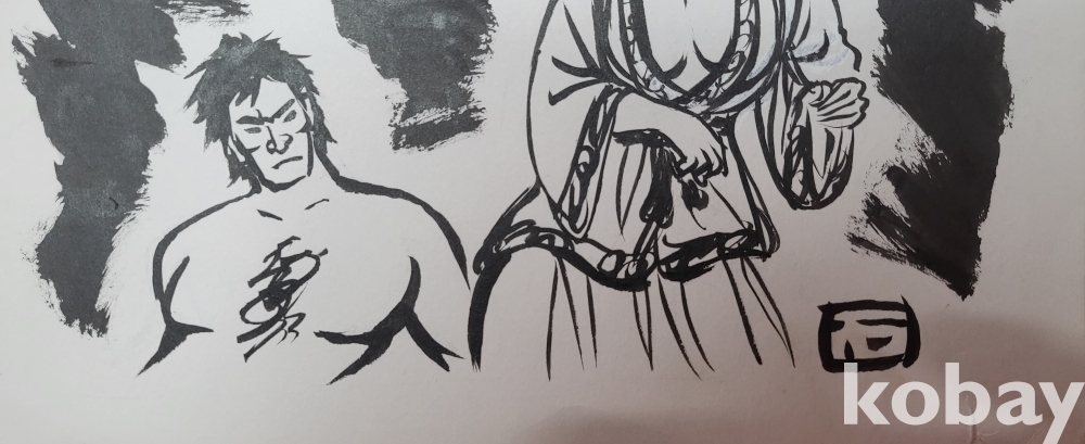 물과 먹으로 만 직접 그려진 수묵화 삽화입니다,