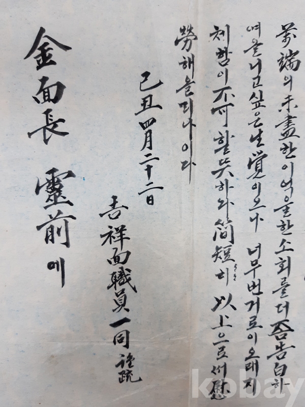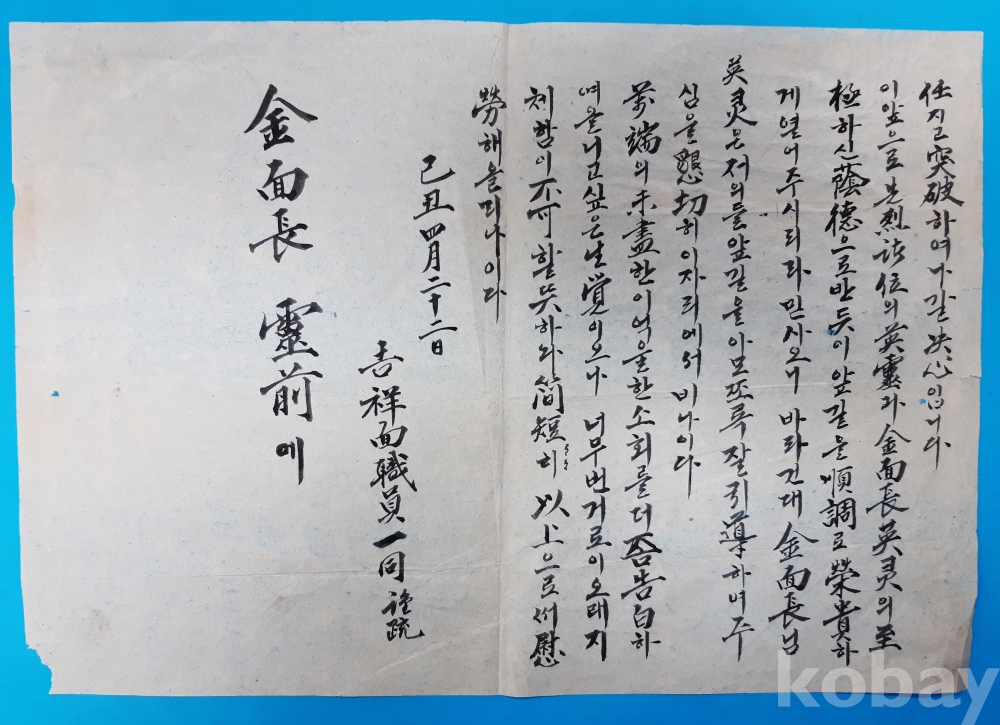 **** 吉祥面 金面長 靈前에 올리는 글 (강화군)/직접 쓴 글이며 말미에 己丑年은 1949년으로 추정된다 (38*27cm)