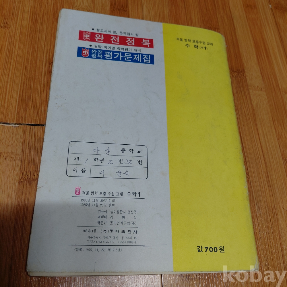 동아겨울방학 보충수업 교재 중학교 수학 1학년 1985년 동아출판사 발행 올려드립니다