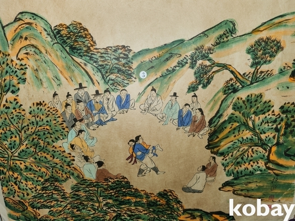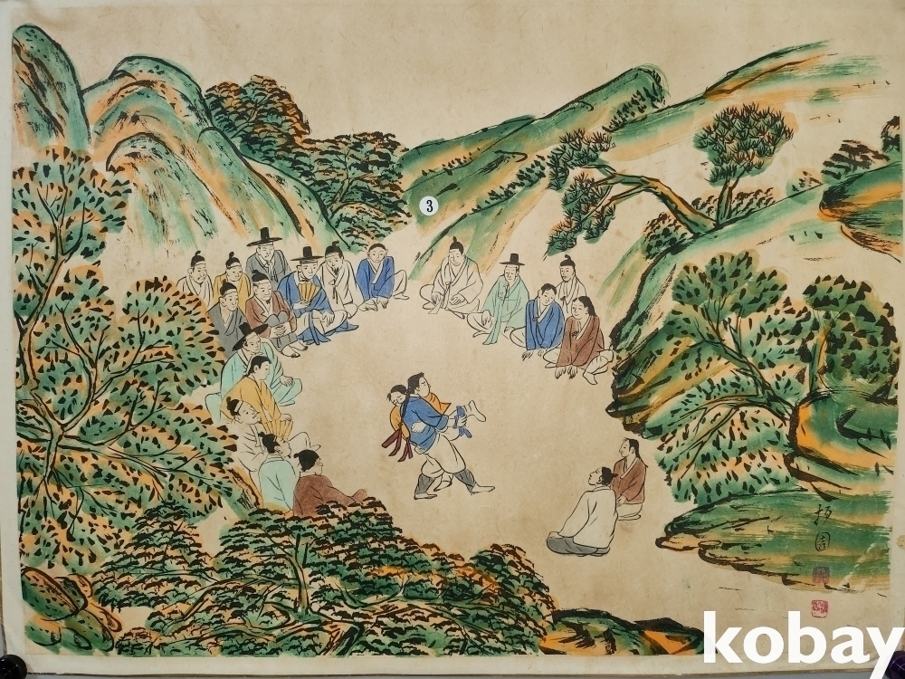 종이에 채색된 민속놀이 씨름하는 그림입니다,