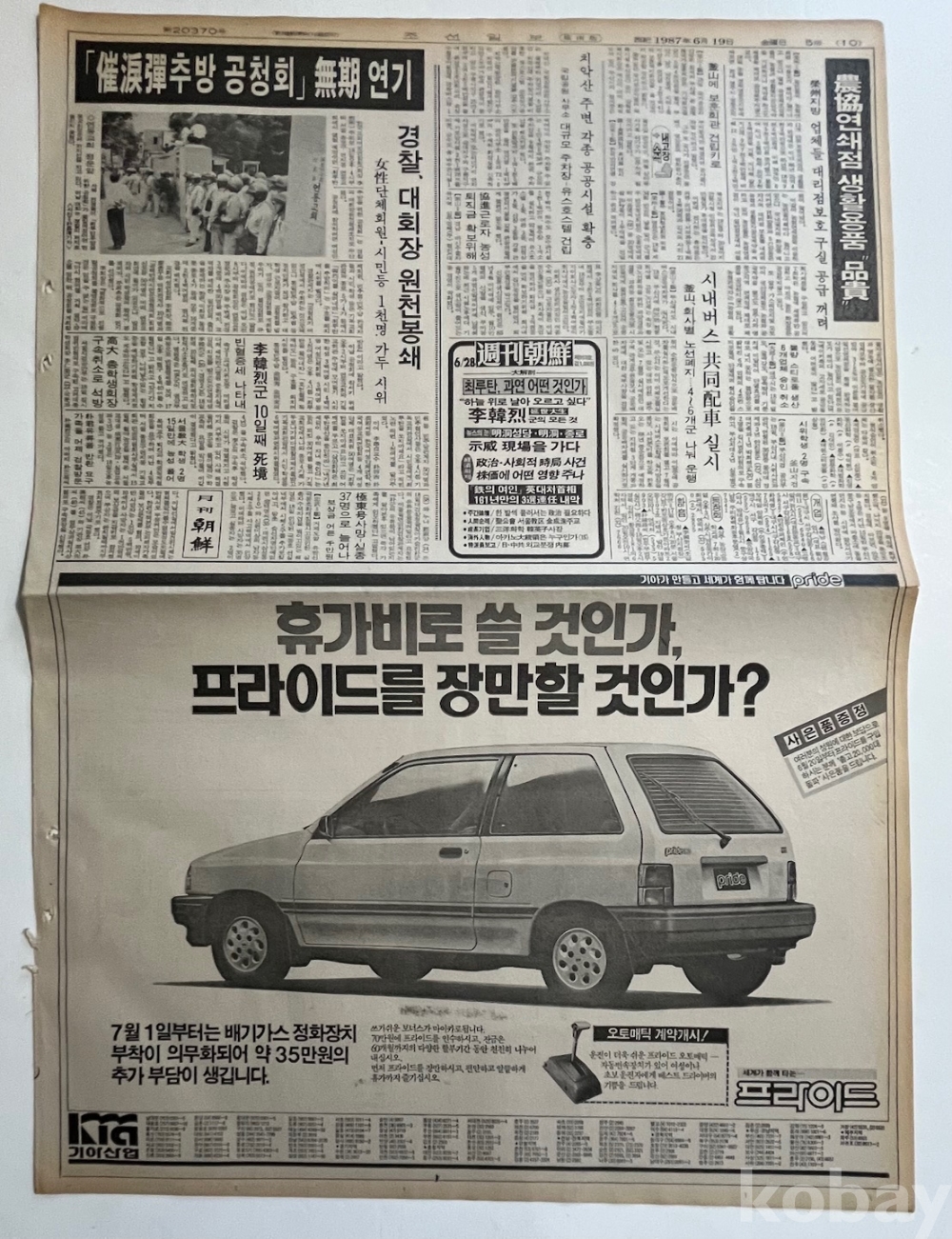 기아산업 프라이드 자동차 광고가 실린 1987년 조선일보 낱장입니다.