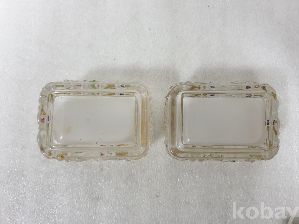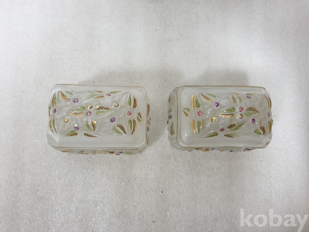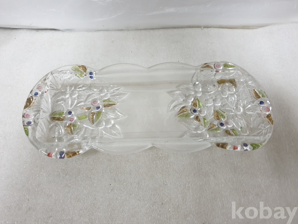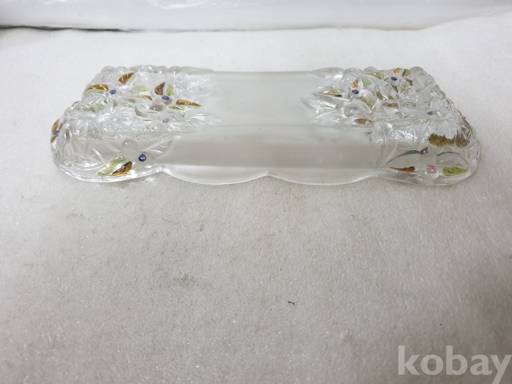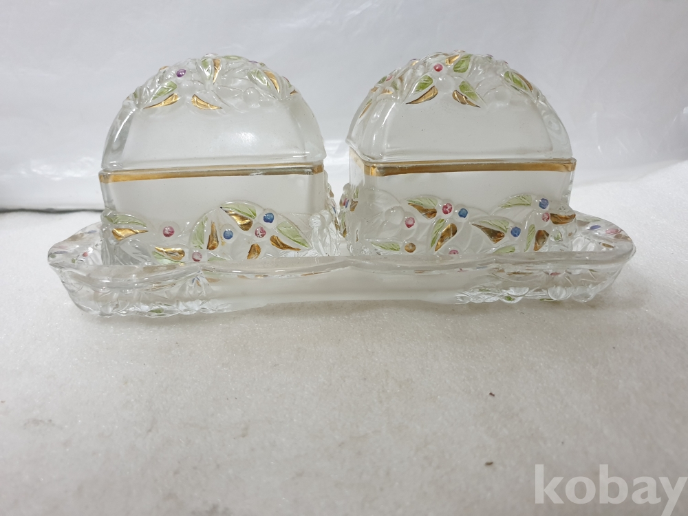 {천원경매} 10-1761 꽃 장식 유리 용기 2개(9.5*6.5*9.5)+ 받침(26*11.5)