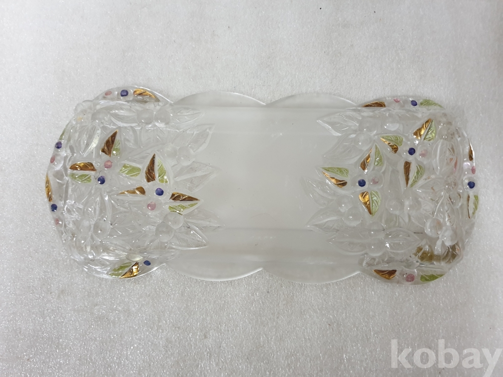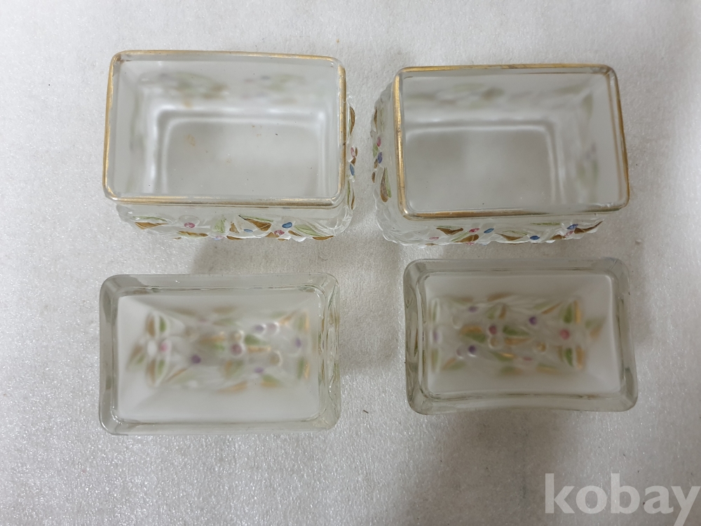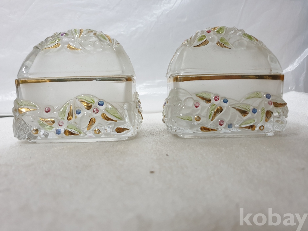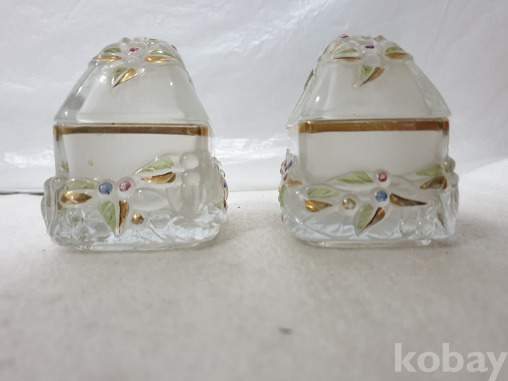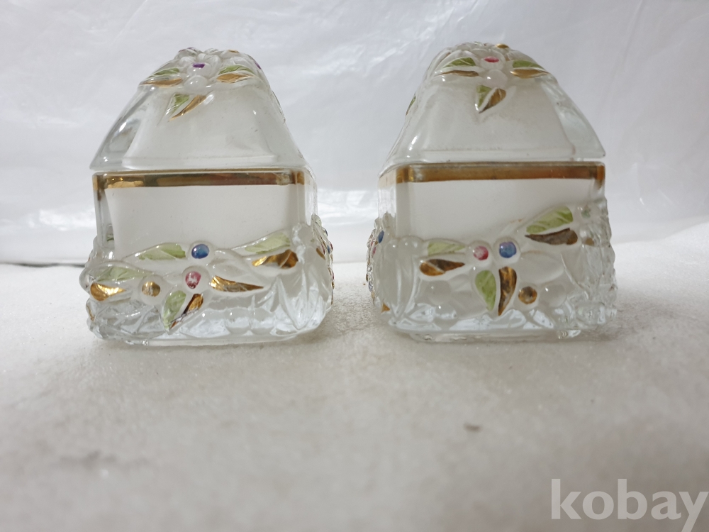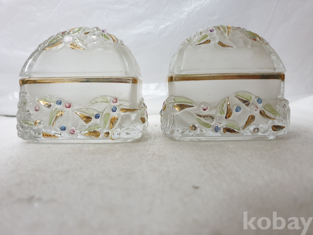 {천원경매} 10-1761 꽃 장식 유리 용기 2개(9.5*6.5*9.5)+ 받침(26*11.5)