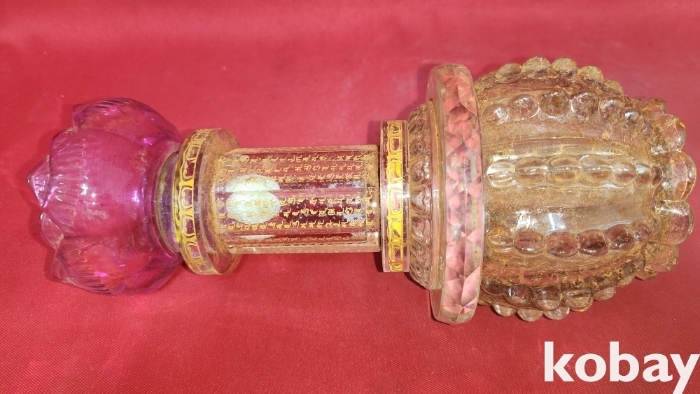 목선에 8각에는 세로로 불교용 범어(梵語)가 음각으로 새겨져 있는 공력이 많이 가미된 특별한 사리함입니다, 목선에 8각 내부에는 사리가 들어 있어서 눈에 보입니다,