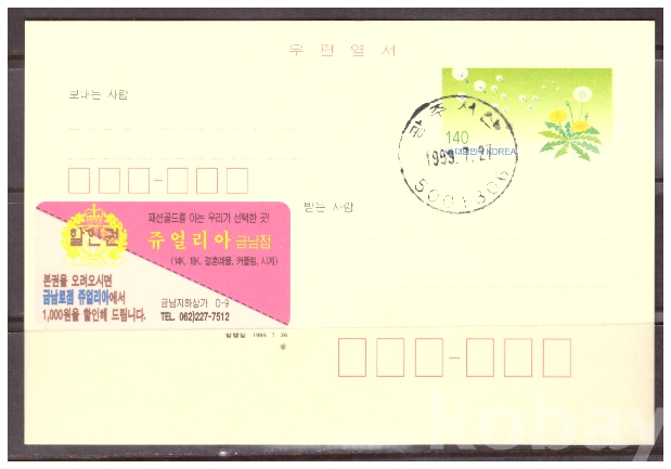(광고엽서) 1999.7.26 지방판 LAPC346 쥬얼리아금남로점 (민들레 140원) (초일일부인)