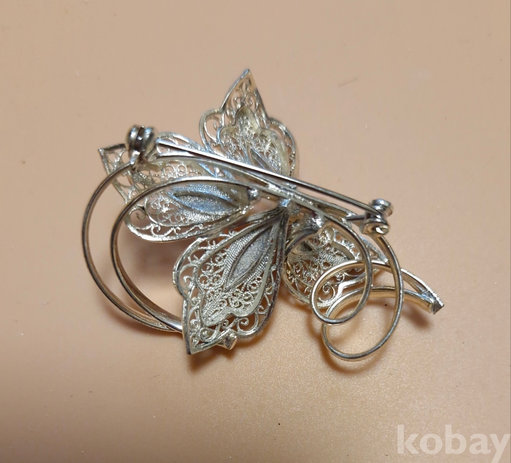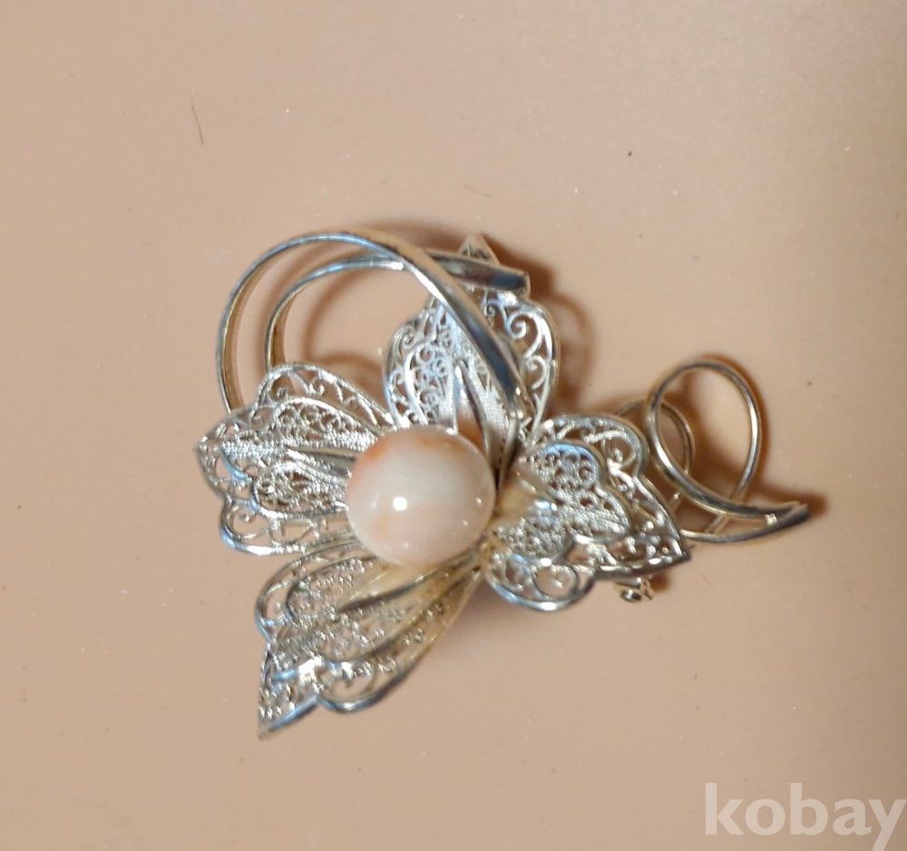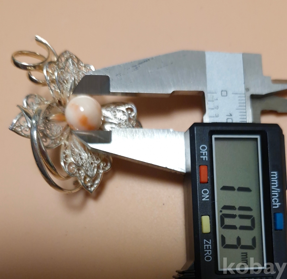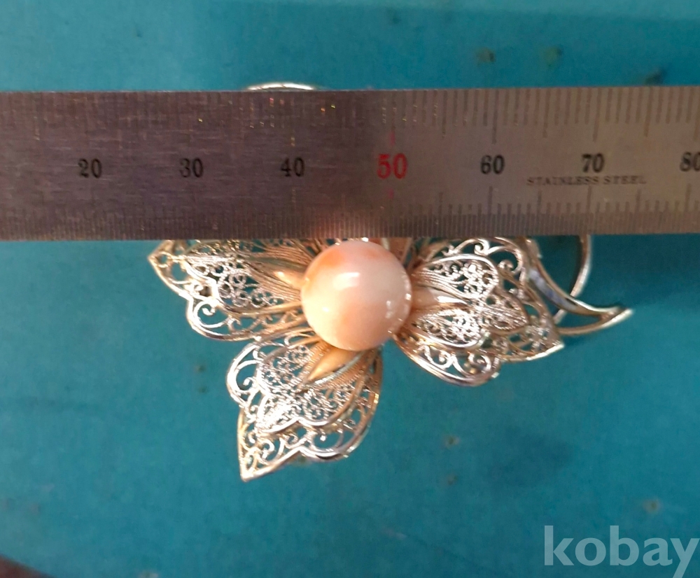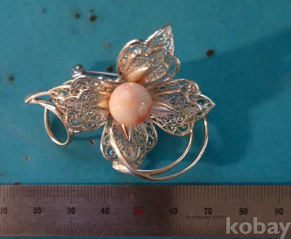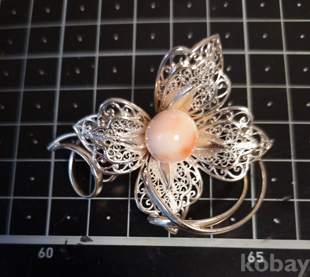 연분홍의 커다란 천연산호(11mm)가 있는 브로치입니다.