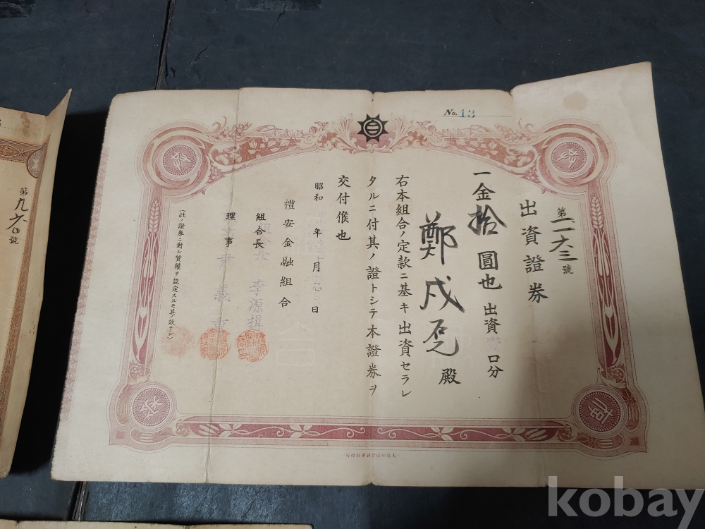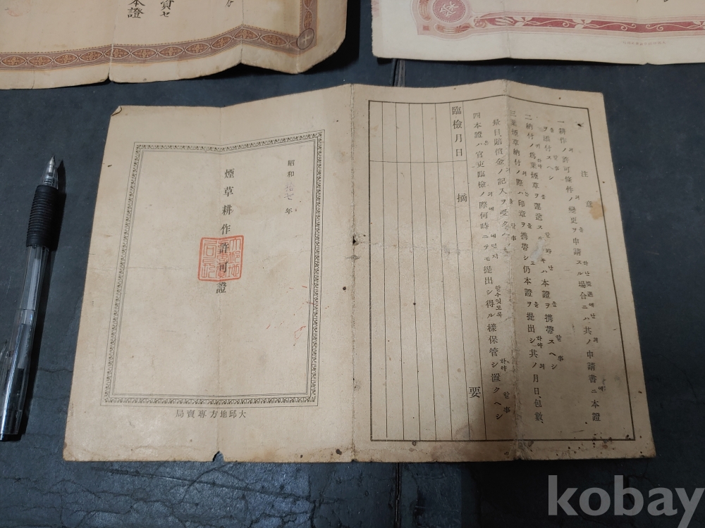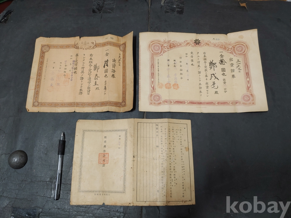 ""연초경작허가증 (소화17년), 예안금융조합 출자증권 (소화6년, 13년-2개) 3개""