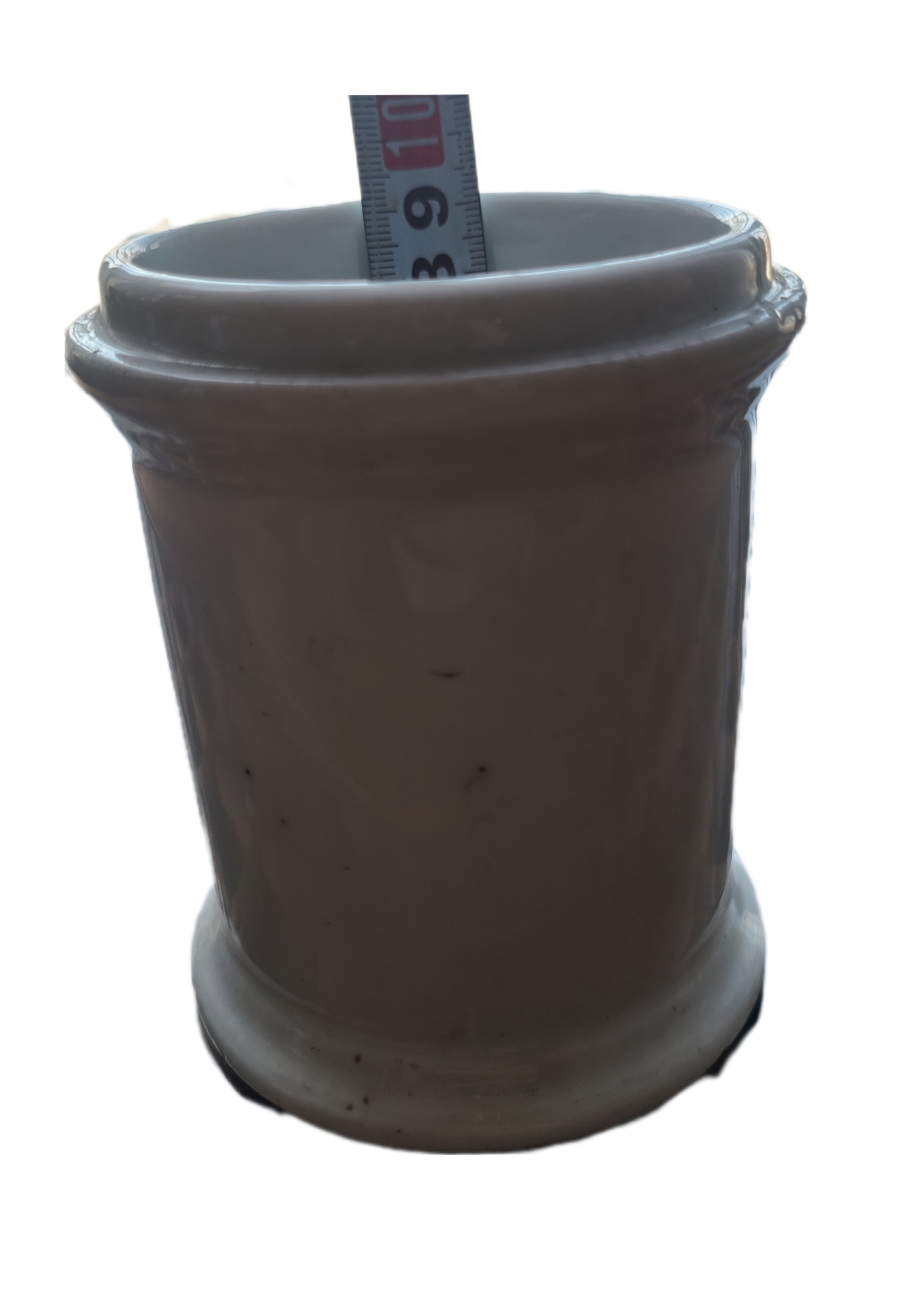 이 물품은 유백색 또는 연한 미색의 백자 또는 도자기 재질로 만들어진 원통형 용기입니다.