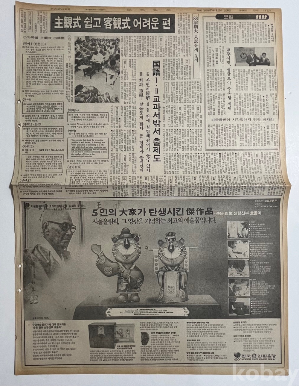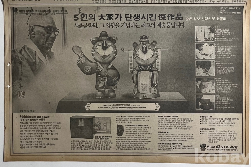 88 서울올림픽 기념품 순은칠보 신랑신부 호돌이 광고가 실린 1987년 조선일보 낱장입니다.