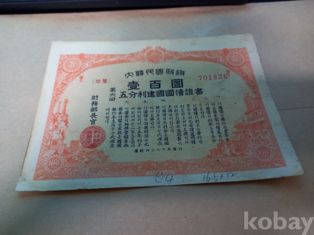 신 4) 대한민국정부 일백원 제6회 오분이건국국채증서