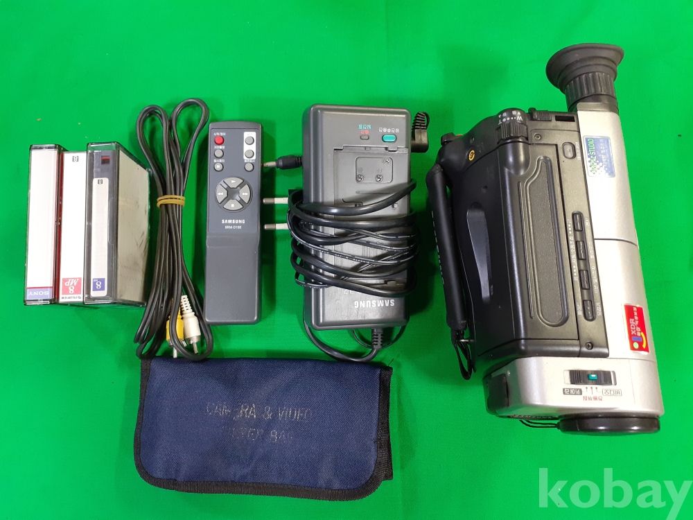 비디오카메라, 리모컨, 배터리충전기 겸용 전원 연결케이블, RCA연결케이블, 전용가방, 8mm테이프 3개, 있으며
