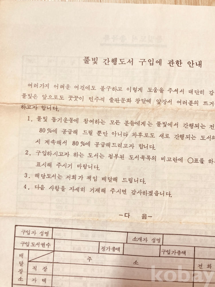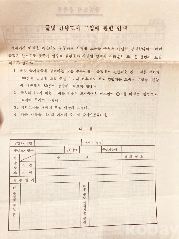 [민주화 운동 자료] "풀빛출판사 간행물 구입에 대한 안내"
