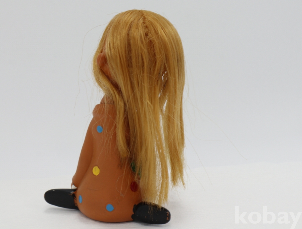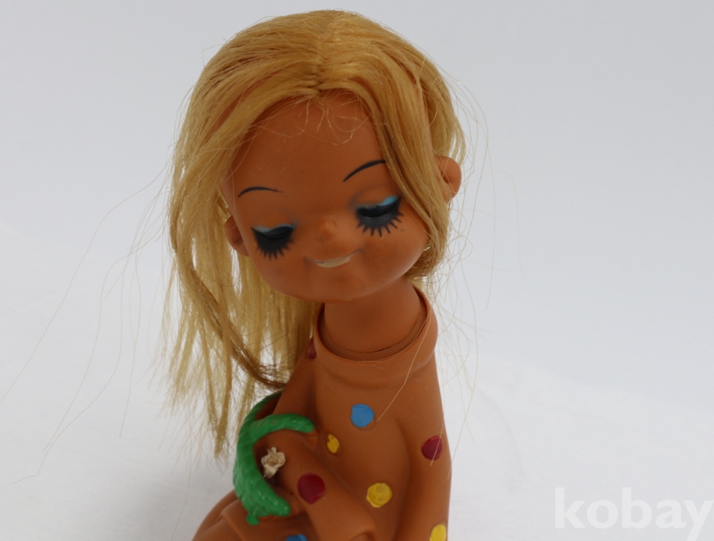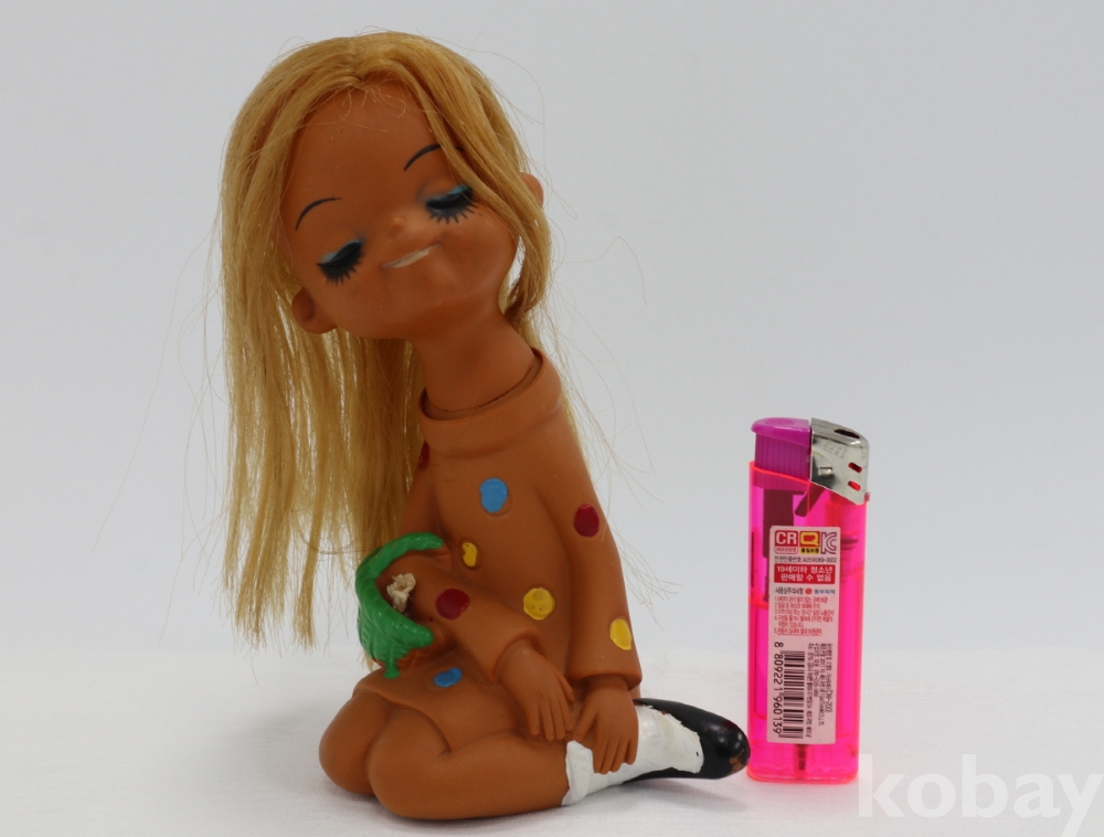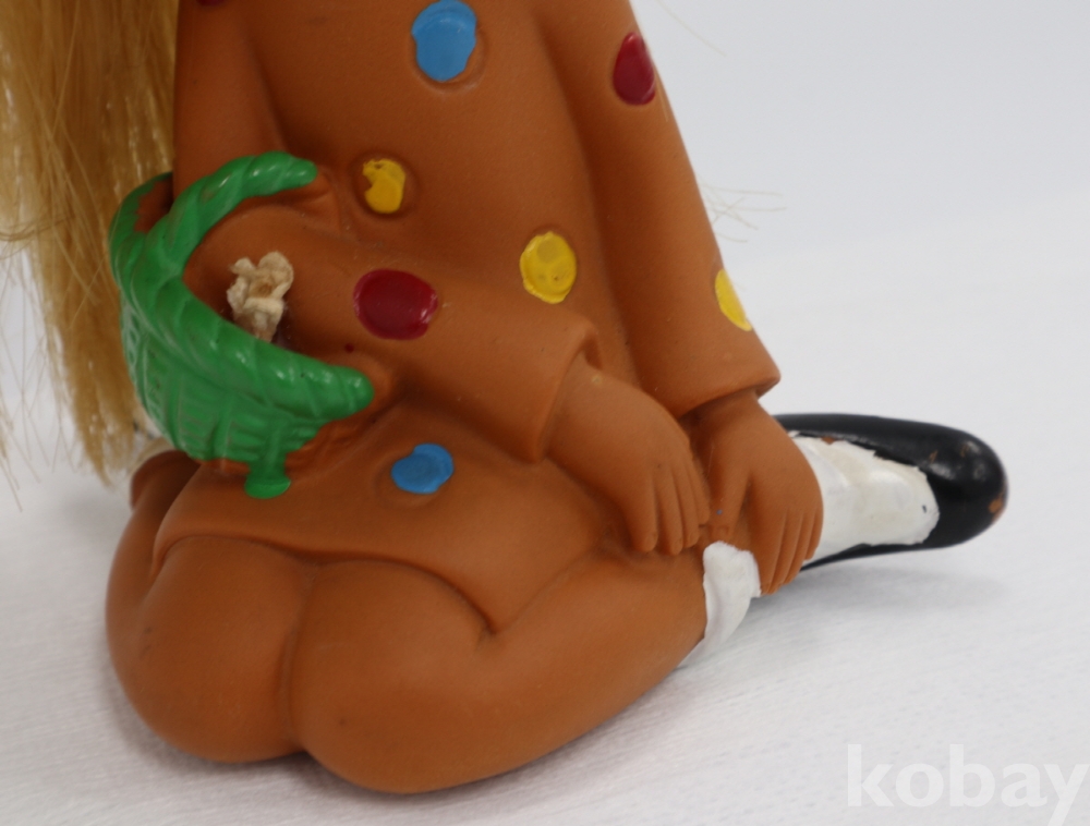 꽃바구니를 들고 앉아있는 긴머리 원피스 소녀 인형입니다