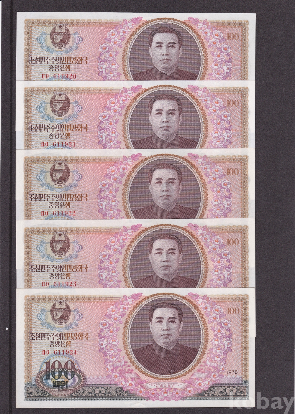 -희귀- 윗동네 1978년 조선민주주의인민공화국 백원 5연번 미사용 지폐 -5장 일괄