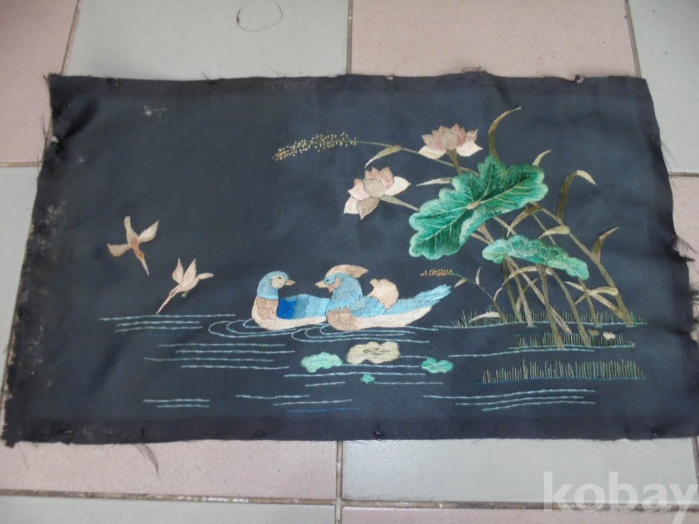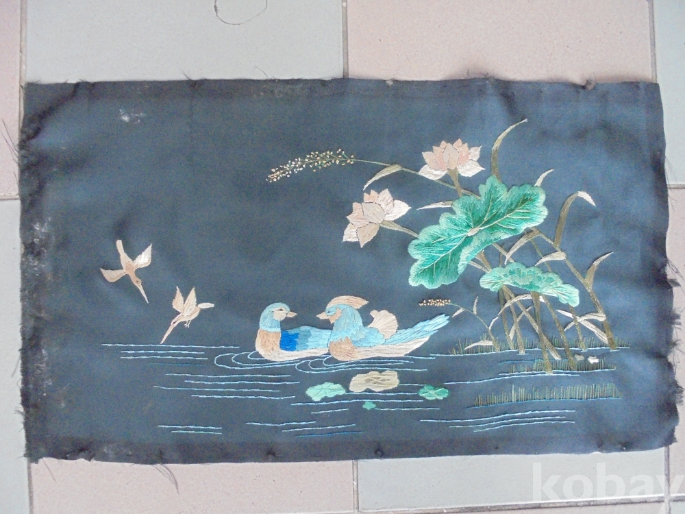 바탕이 검청색에 연화와 갈대꽃 아래 원앙오리암수가 사랑을 속삭이고 잠수하는 정성이 많이들어간 한땀한땀 잘놓은 연화와 원앙오리 손수