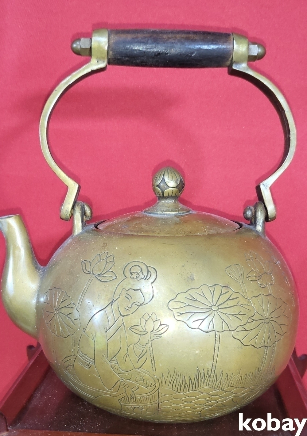 중화민국3년(1914년) 황동 연꽃과 여인 동자문양 사용제 주전자입니다,