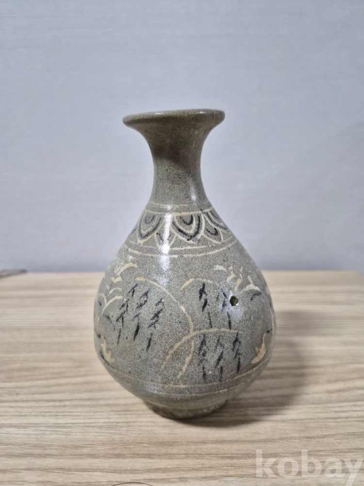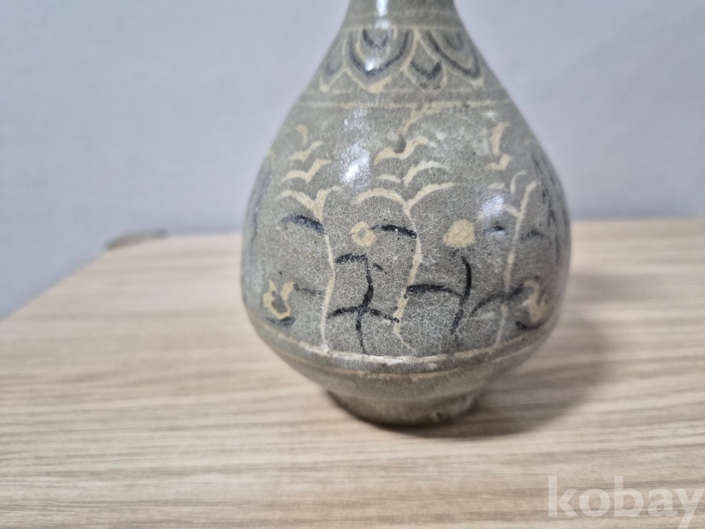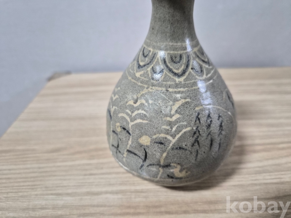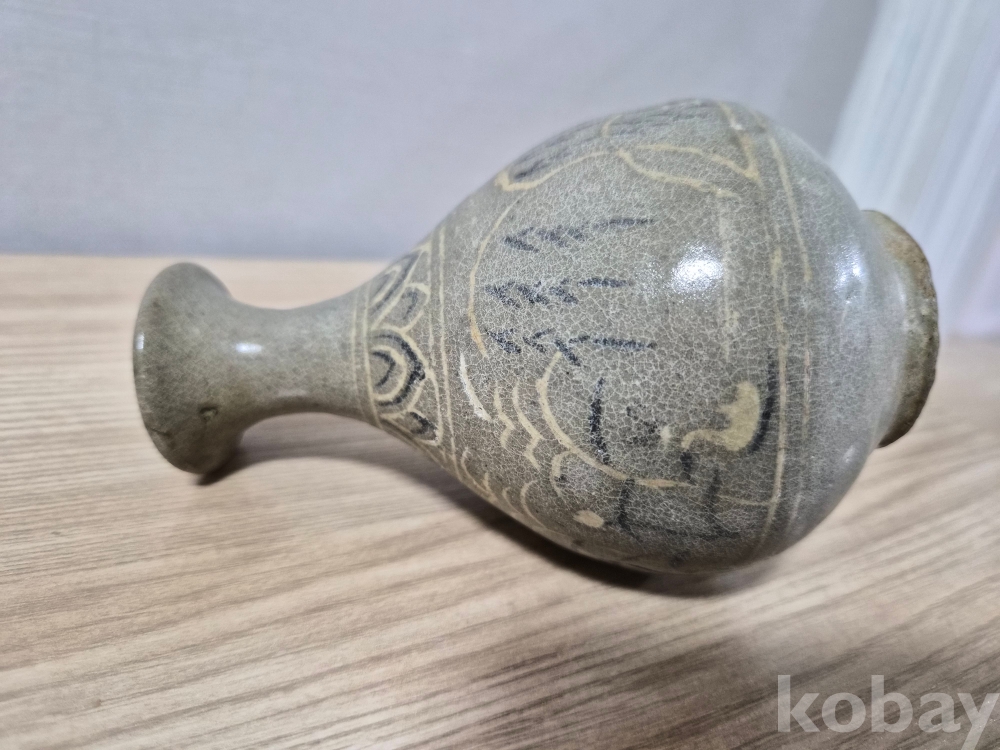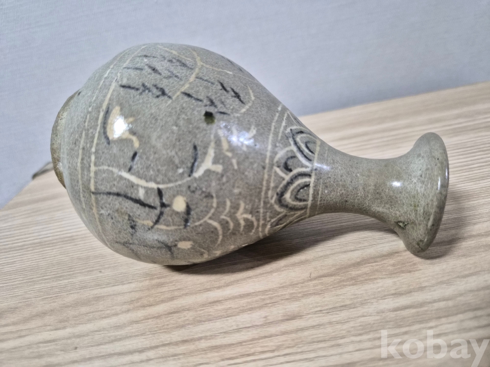 분청사기 흑백상감 수류문에 면상감4마리가 시문되었고 어깨부분에는 연판문이 흑백상감으로 되어있습니다 구연부에