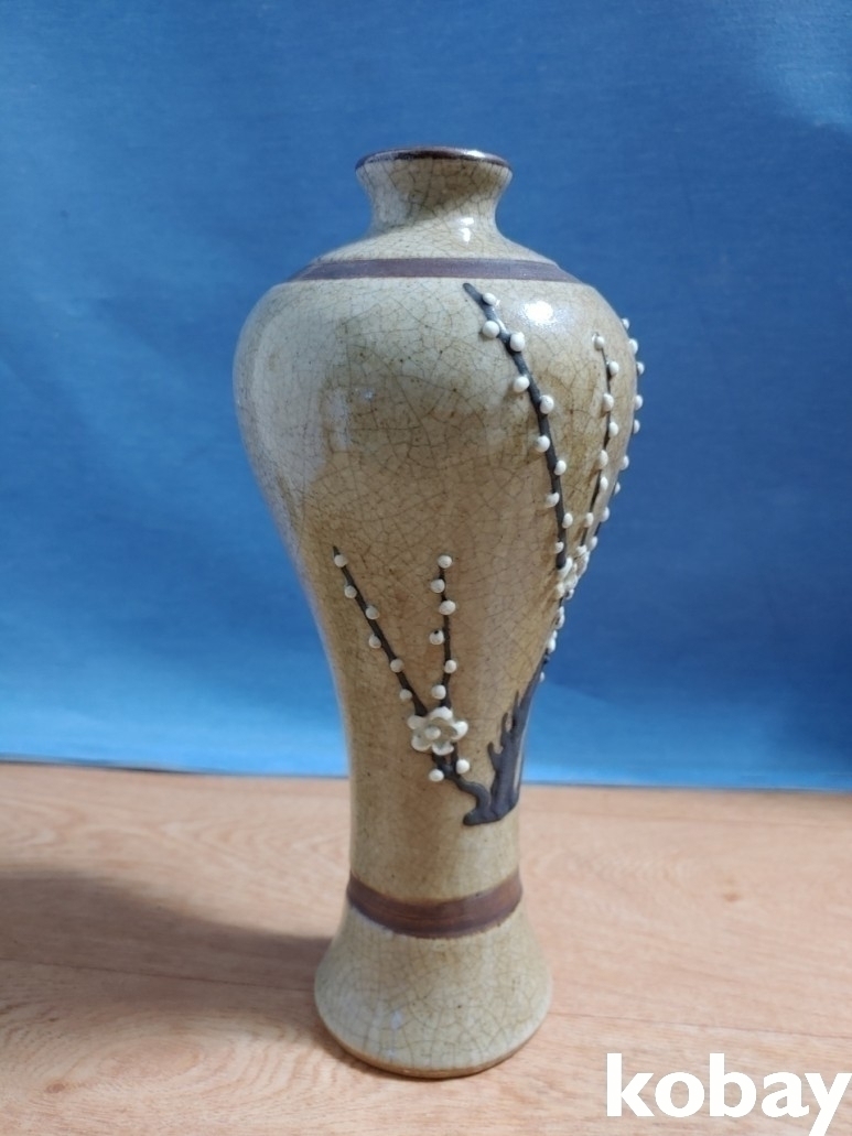 매화꽃이 표현된 긴 매병 도자기 입니다.