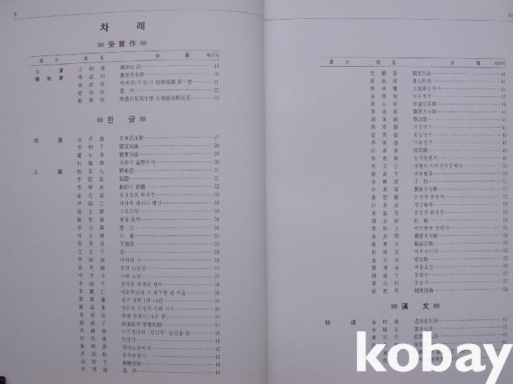 앞에 이사장의 머리말이 있고 뒤에 김준섭 심사위원장과 분야별 심사위원 소개가 있다. 아울러 심사결과로 총 1,863점의 응모작에서 입선 289점, 특선 27점, 우수상 4점, 대상 1점이 도표로 제시되어 있다. 이어서 <개요>와 <심사평>이 실려 있고 대상/우수상의 수상작부터 한글, 한문, 사군자, 전각으로 분야를 나누어 특선과 입선자들을 각각 제목과 함께 수록한 <차례>가 있다.