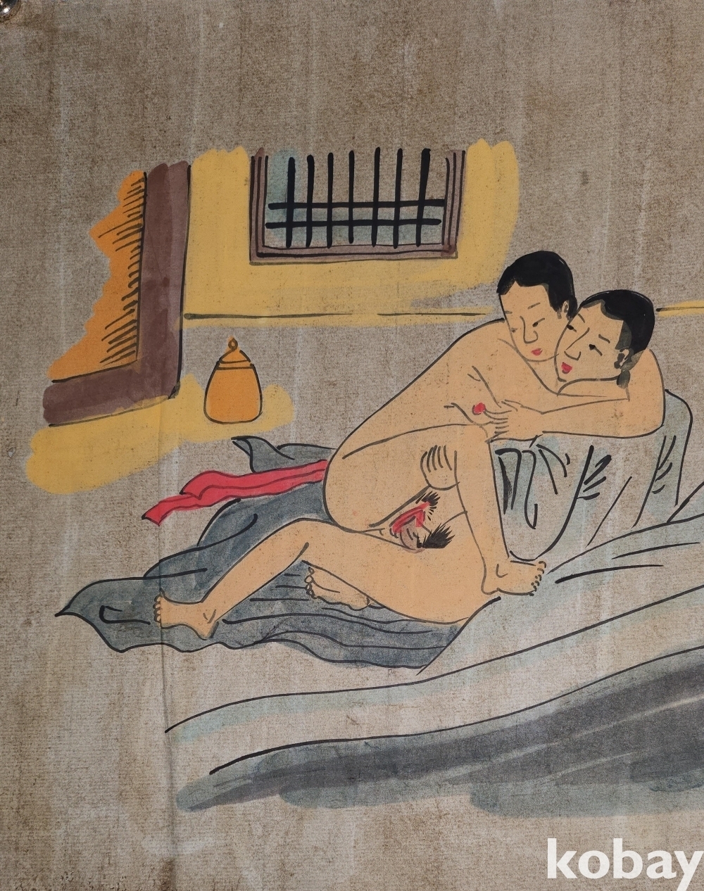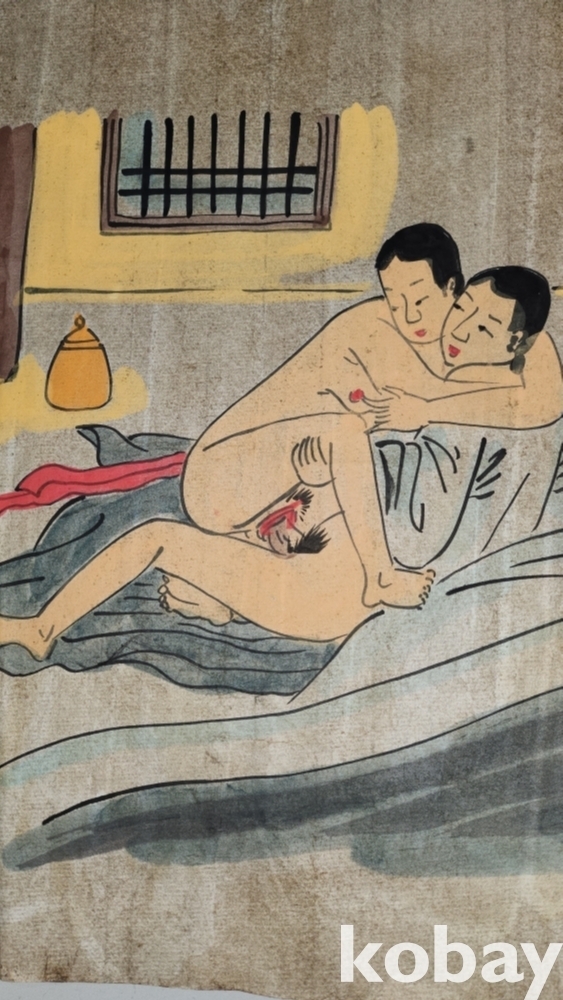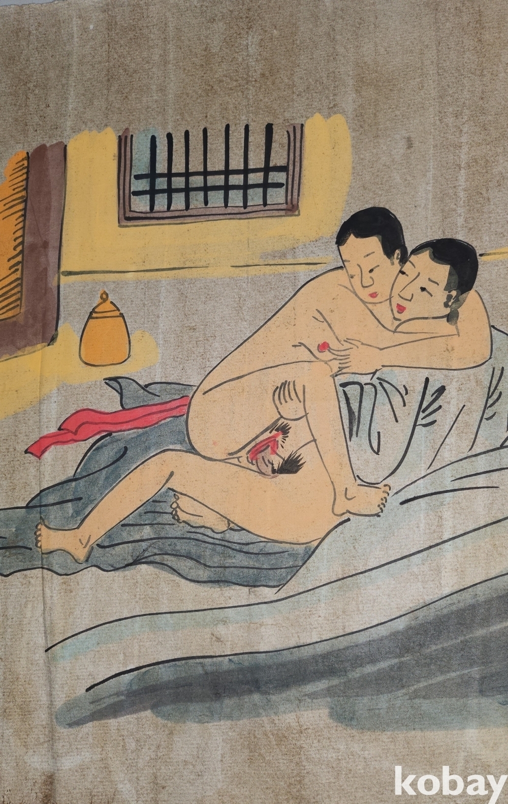 종이에 채색된 남녀 애정 행각을 표출한 그림입니다,