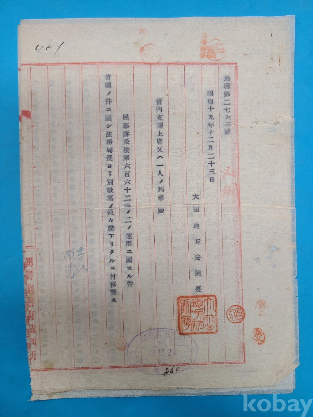 **** 1944년 대전지방법원장이 보낸 문서 [민사소송법제662조 적용에 관한 건]