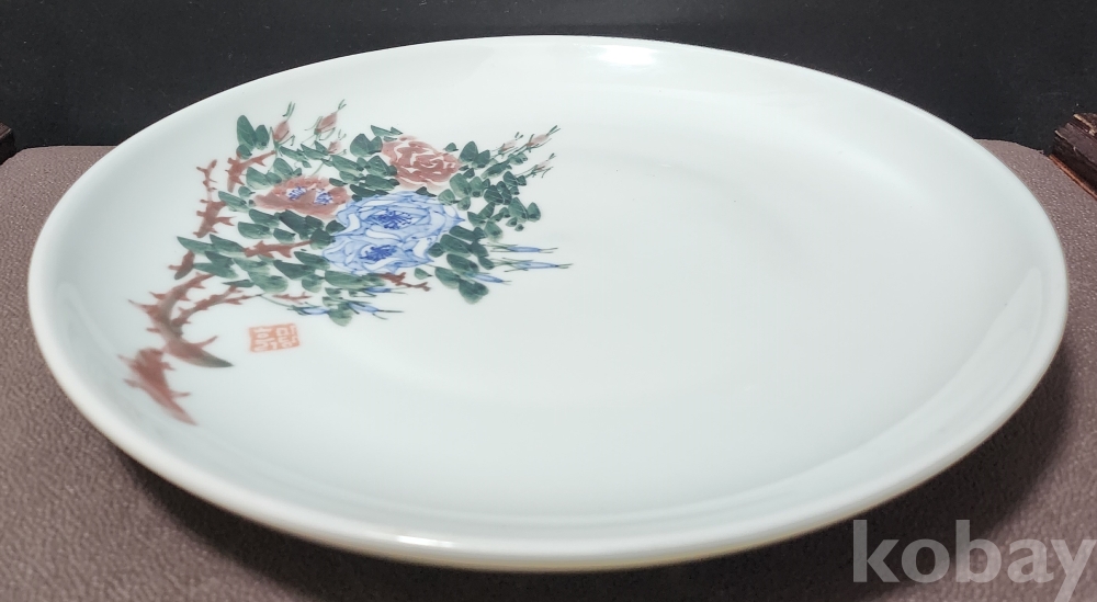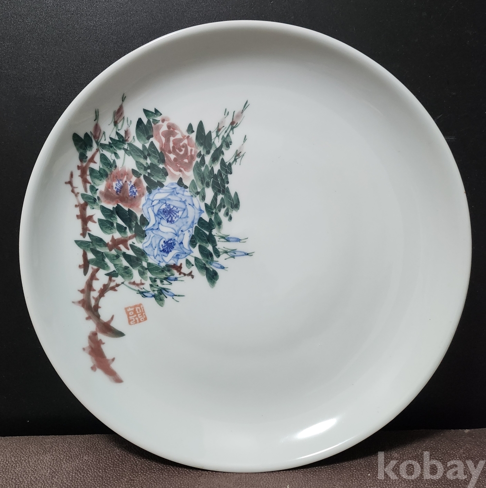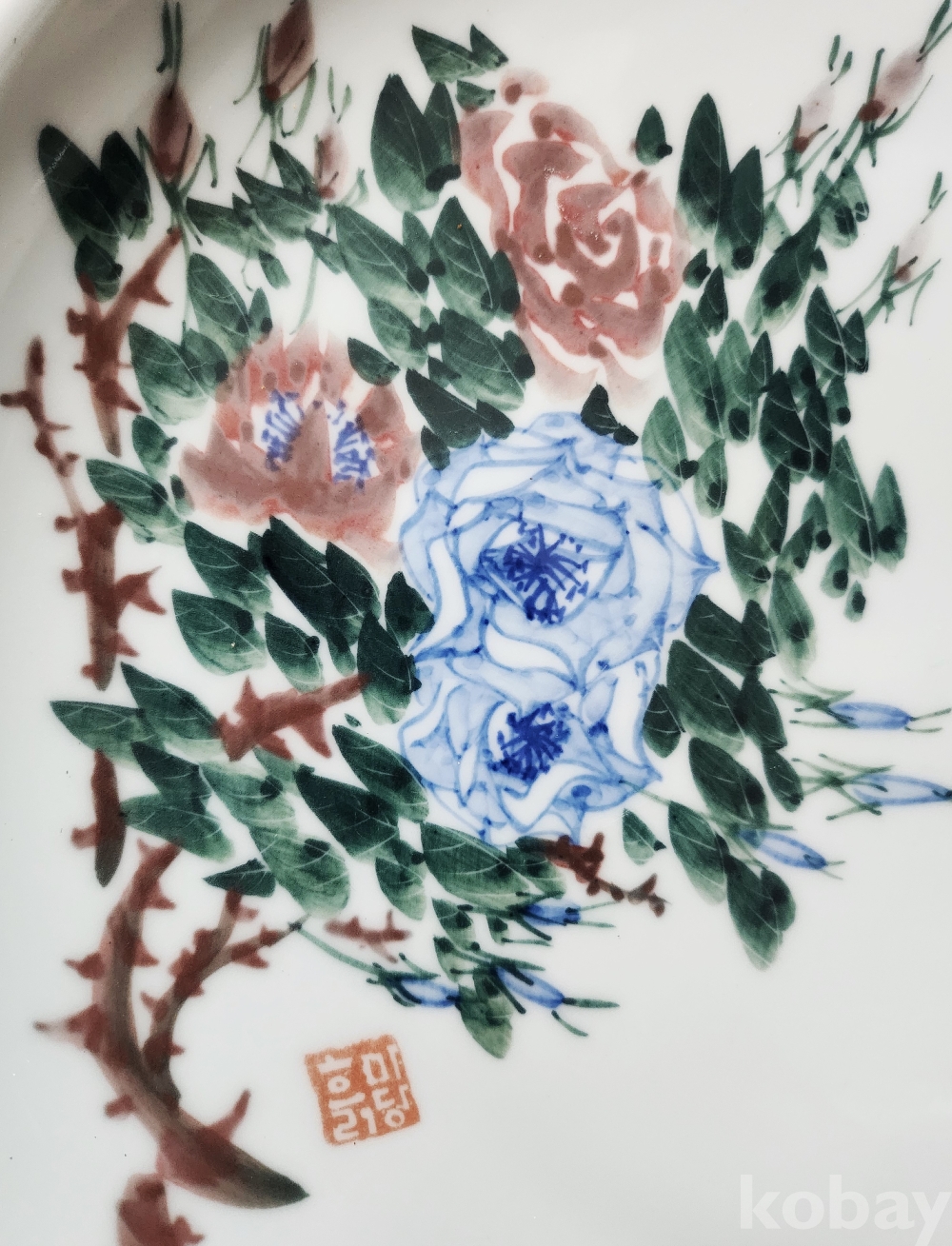 < 도예가 작품 > 백자청화진사장미문접시 白磁靑華辰砂薔薇紋楪匙