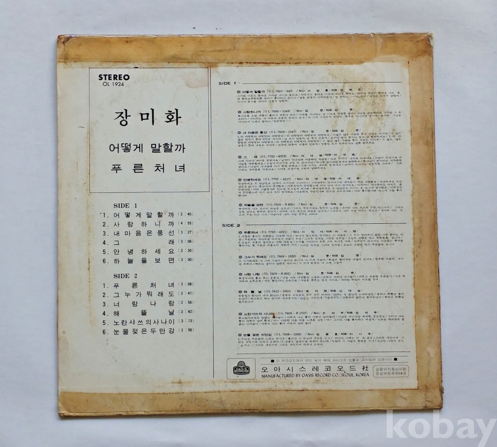 | 자켓상태 | VG : 주름, 접힘, 모서리 찢김 다수 | 음반상태 | EX : 재생에 영향 없는 가벼운 기스 존재 | 발매정보 | 알수없음 | 가사지여부 | 무 |