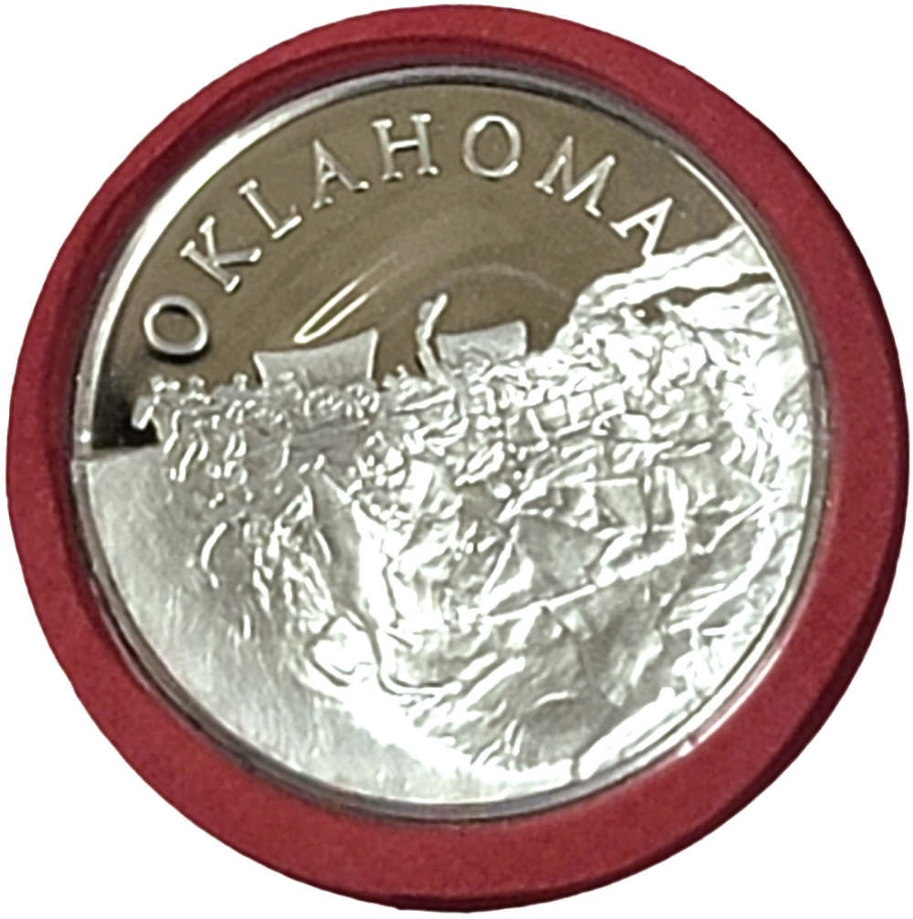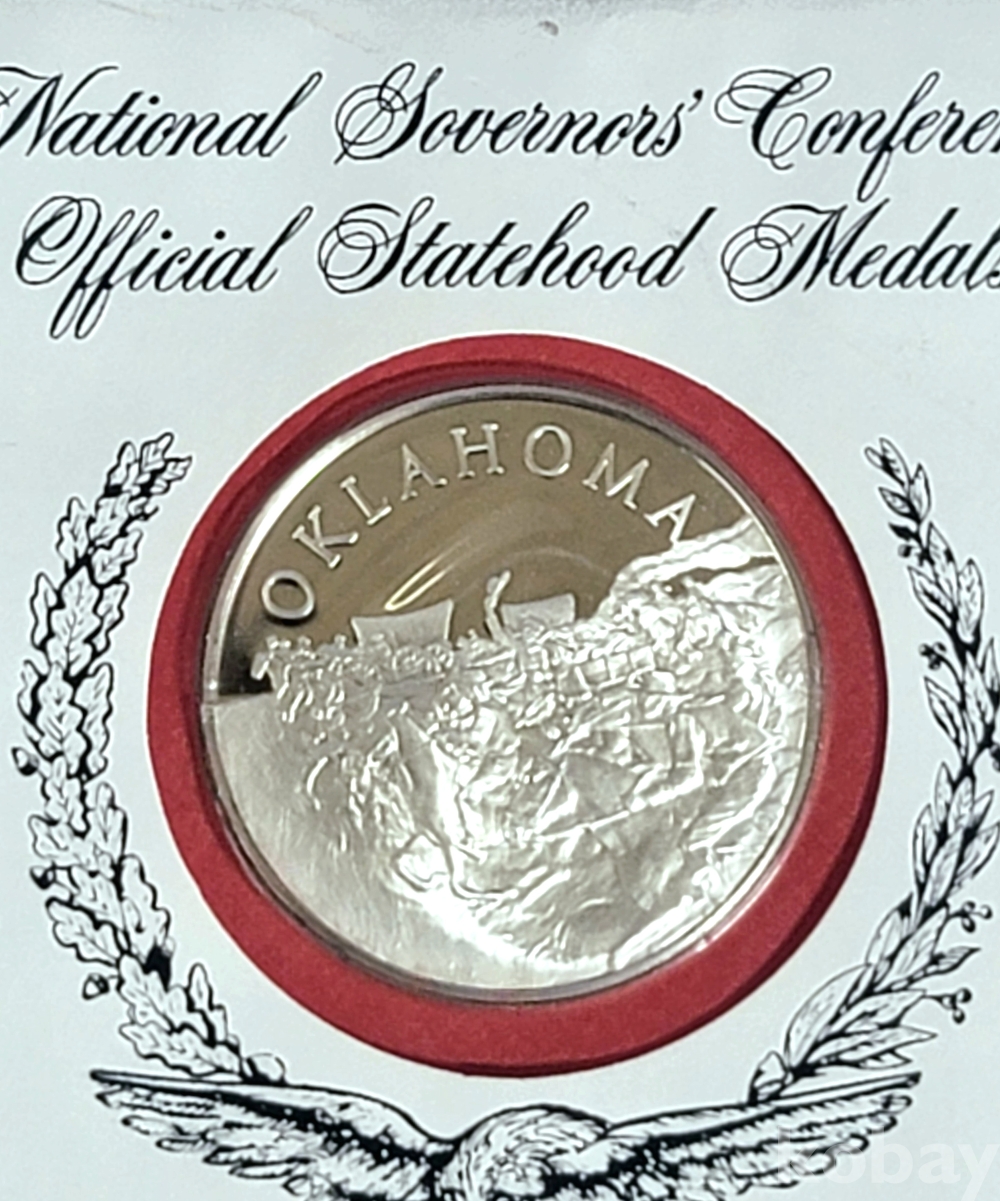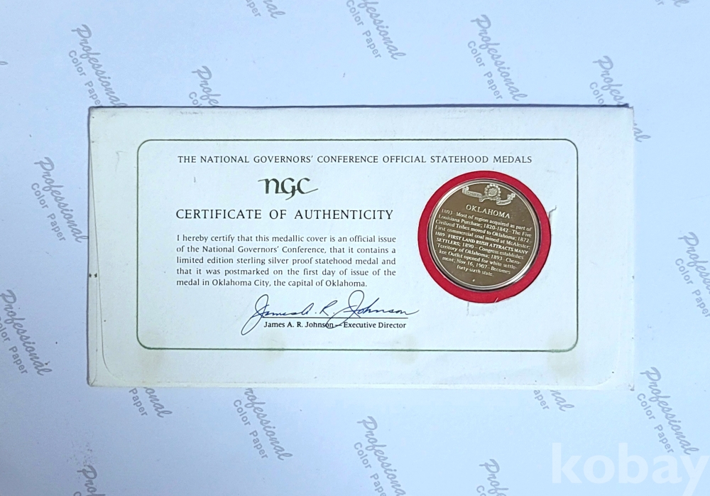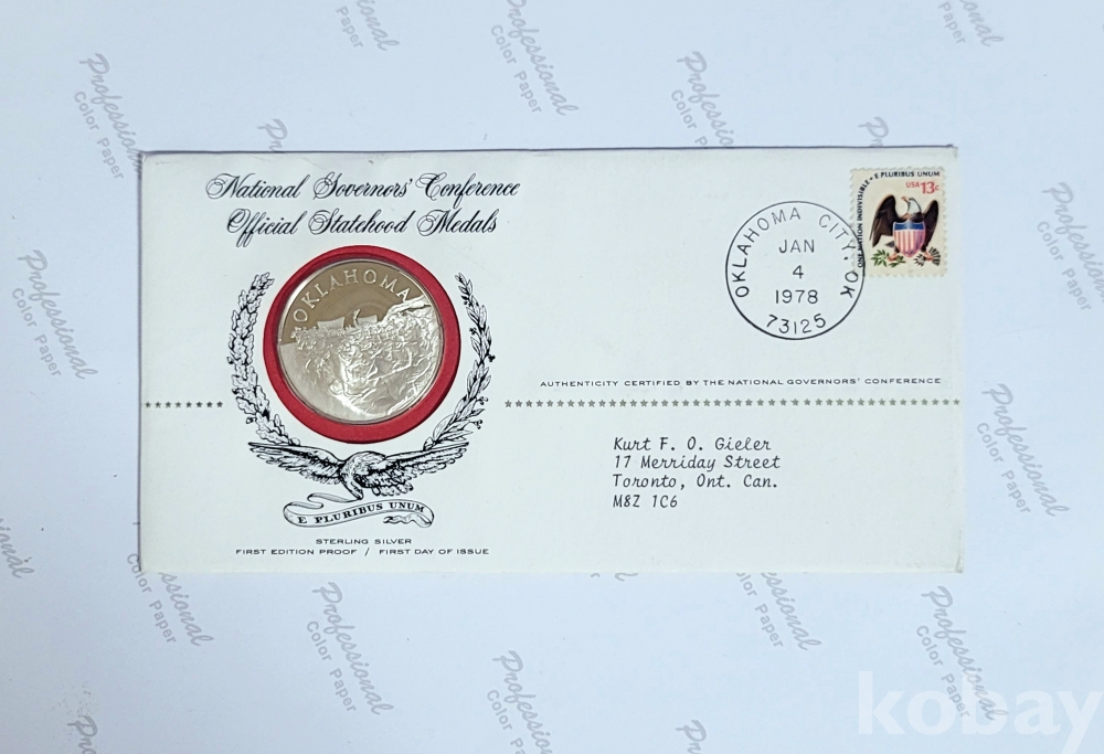 1974년부터 1978년까지 미국 국가 주 회담을 기념하여 발행된 한정판 초판 은화가 담긴 겉지은화 이 겉지는 "National Governors Conference" 로고와 함께 "OKLAHOMA"라는 문구가 새겨져 있으며, 1978년 1월 4일 오클라호마 시티 날짜 도장이 찍혀 있습니다.