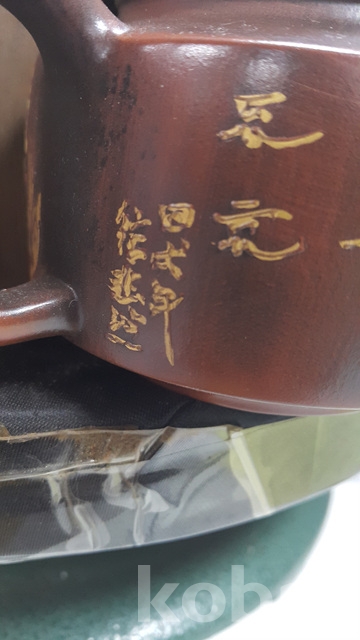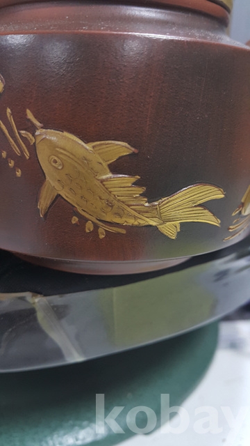 c-138,오동나무박스에든 중국1일자고경주의금칠된물고기문양자사찻주전자(미감정)