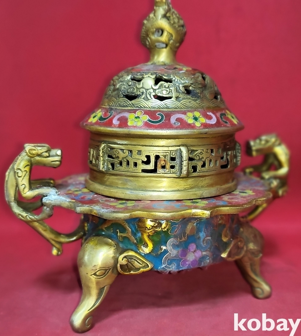 선덕연제 관지있는 동태범랑(칠보) 뚜껑 용문양에 해마 양귀와 삼족 코끼리 문양 향로입니다,