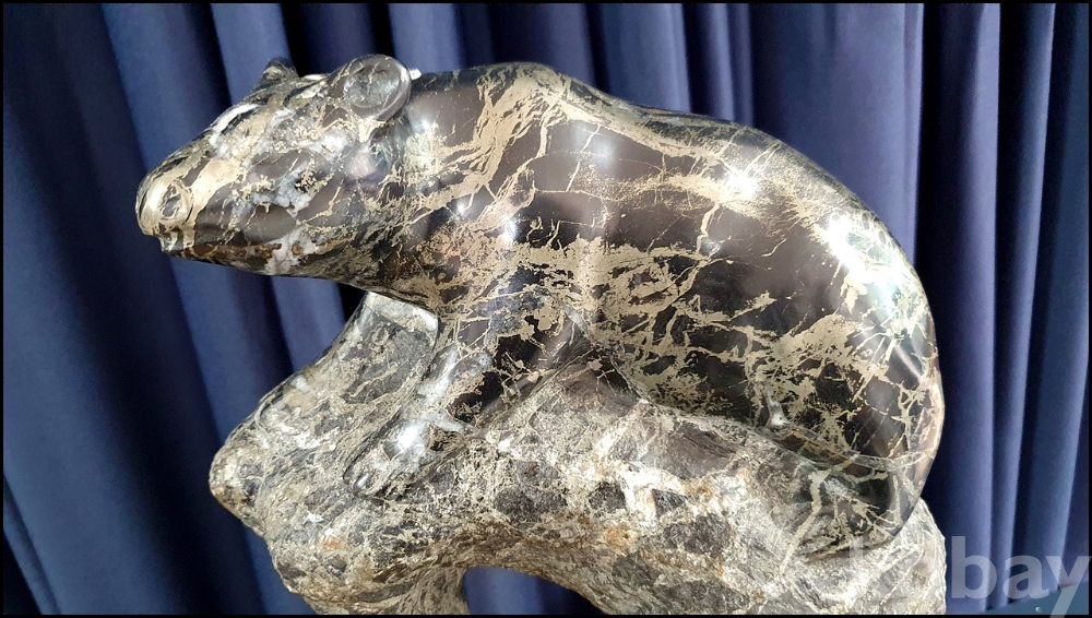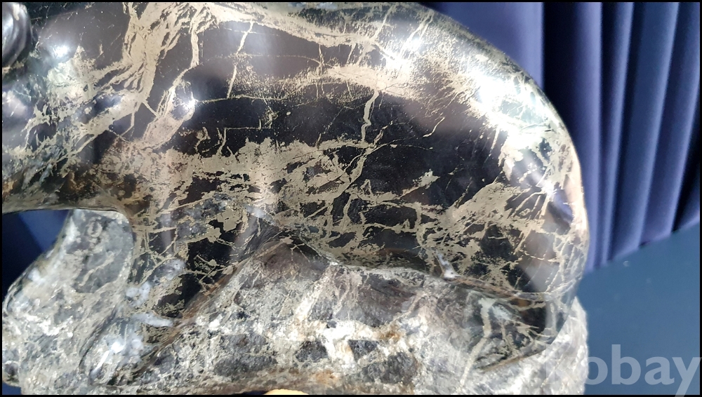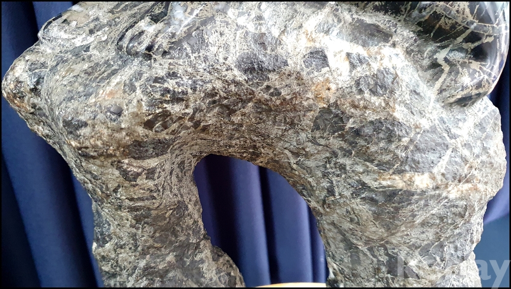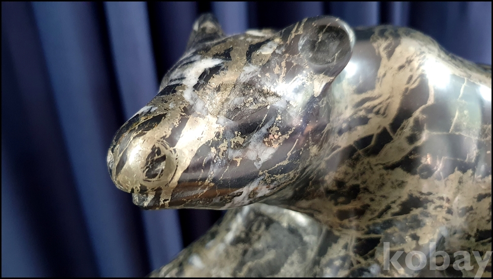 둥근 알 처럼 생긴 원석을 깍아내면 내부에 금빛이 나는 유화철 입자들이 생성되어 있는데