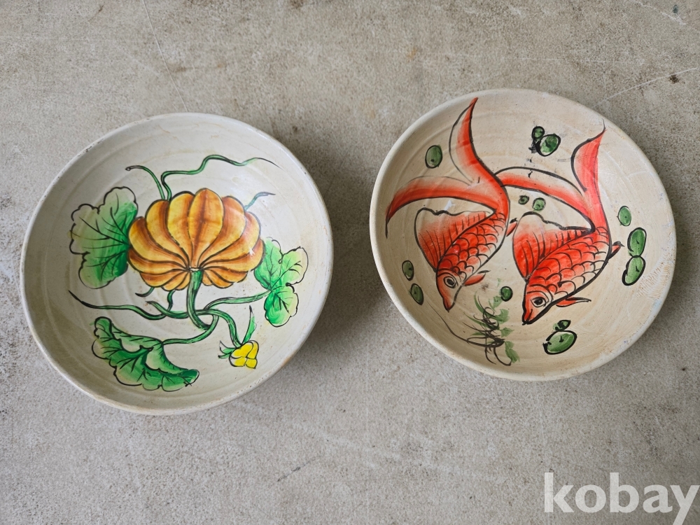 호박과 물고기 그림 도자기 접시 2개 입니다.