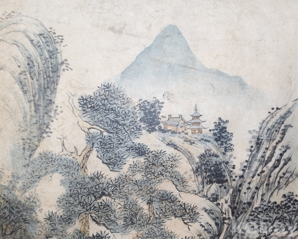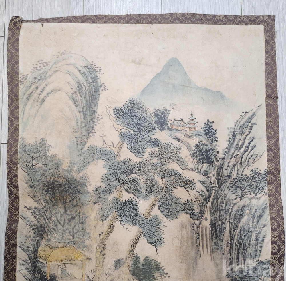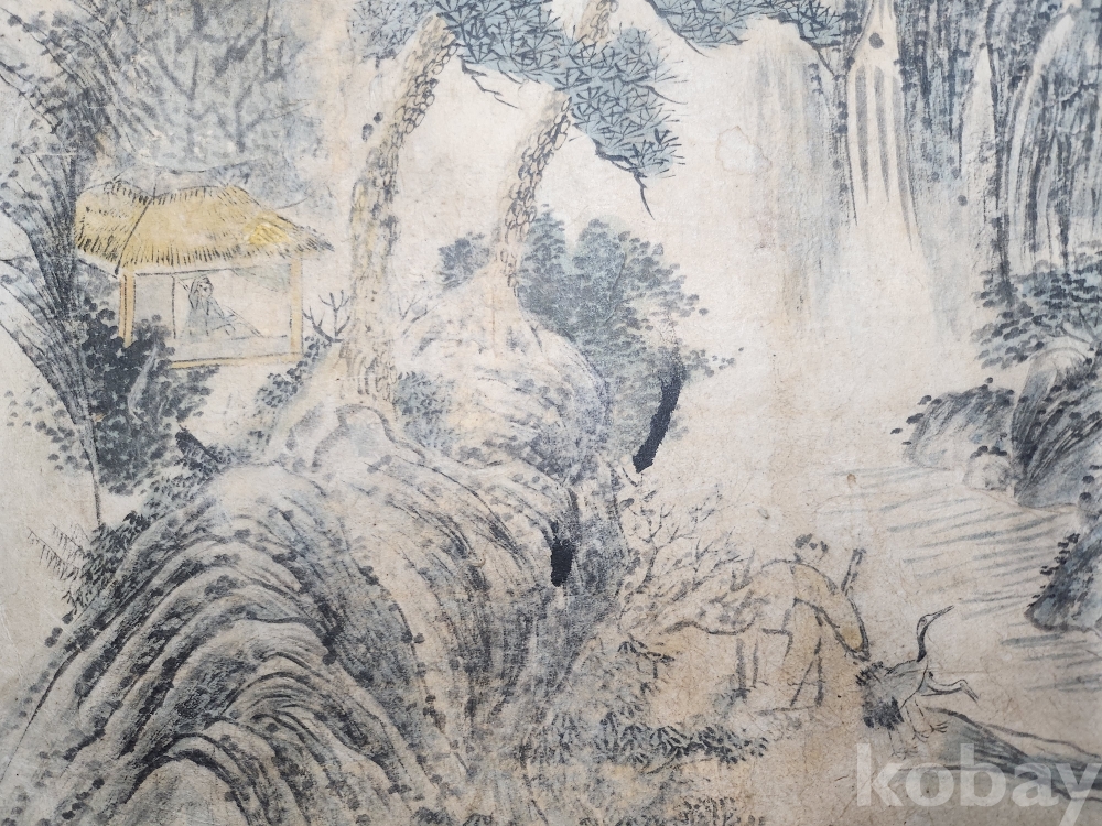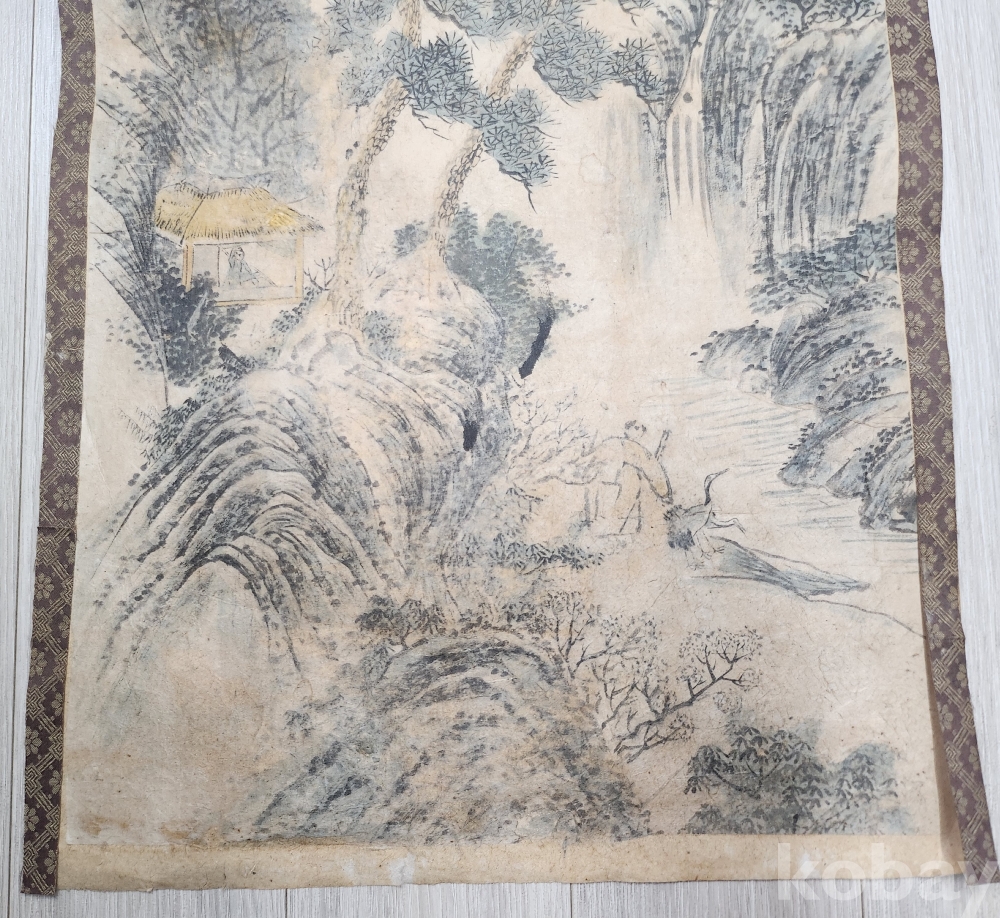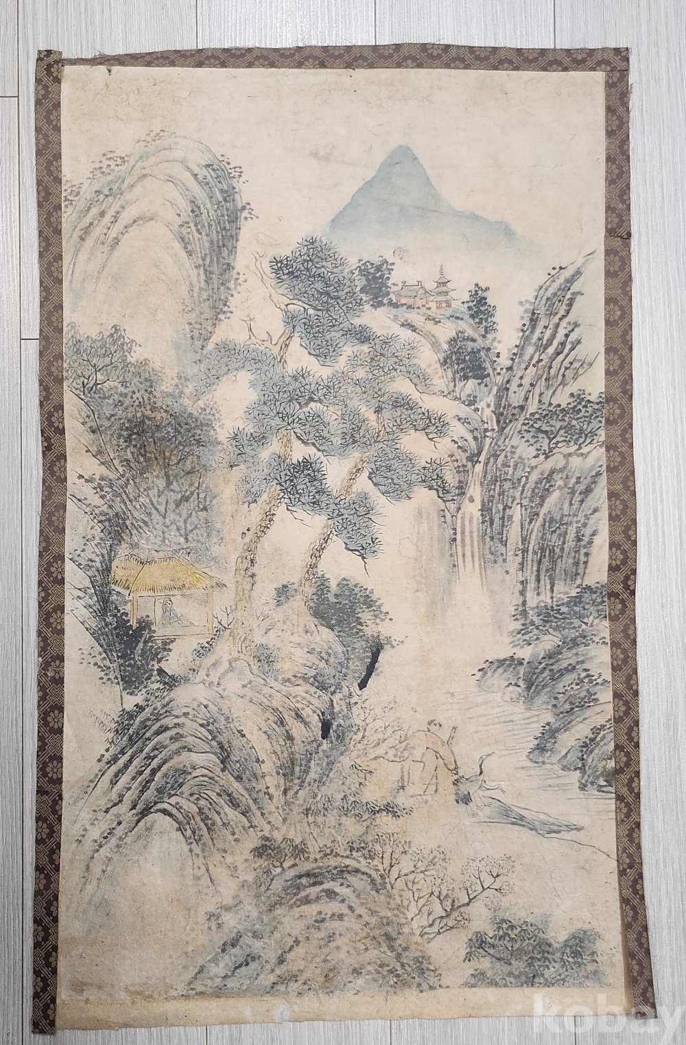 오래된 장지에 그려진 산수화 입니다 액자에서 빼낸상때이고 배접되어 있습니다