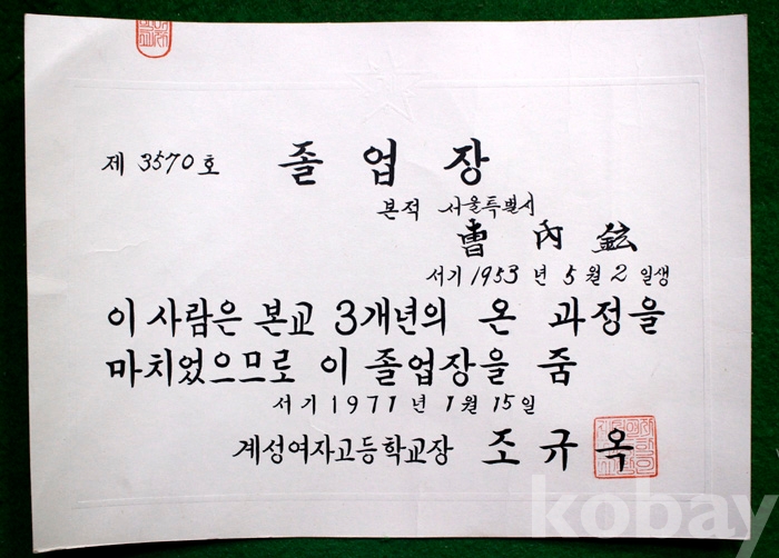 (상장 및 졸업장) 1971년 계성여자고등학교의 졸업장