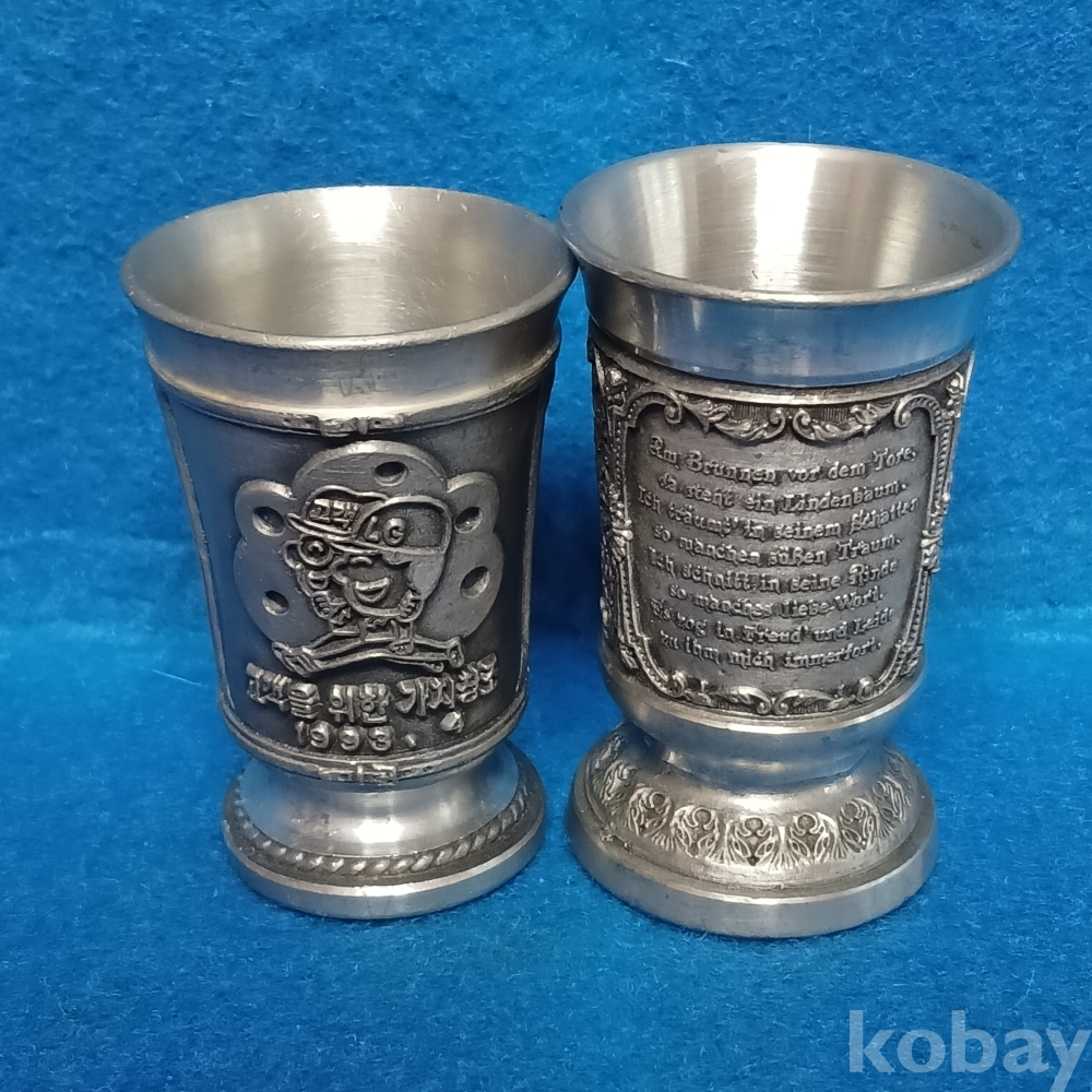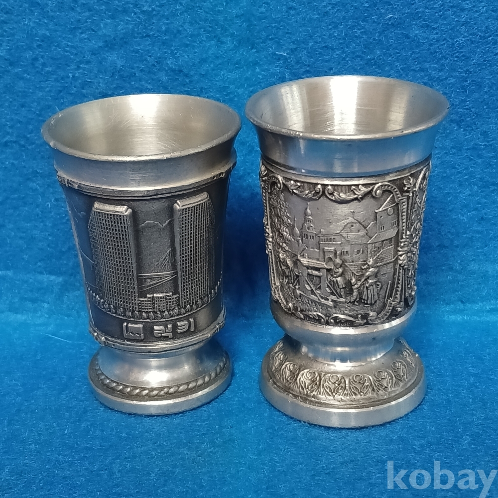 럭키 쌍둥이 빌딩과 사람이 양각되어 있는 작은 주석잔 2점