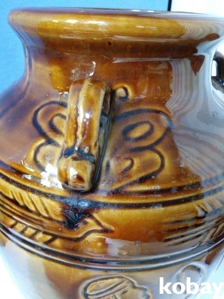 3개의 나비 모양의 고리가 있는 황색 도자기 입니다.